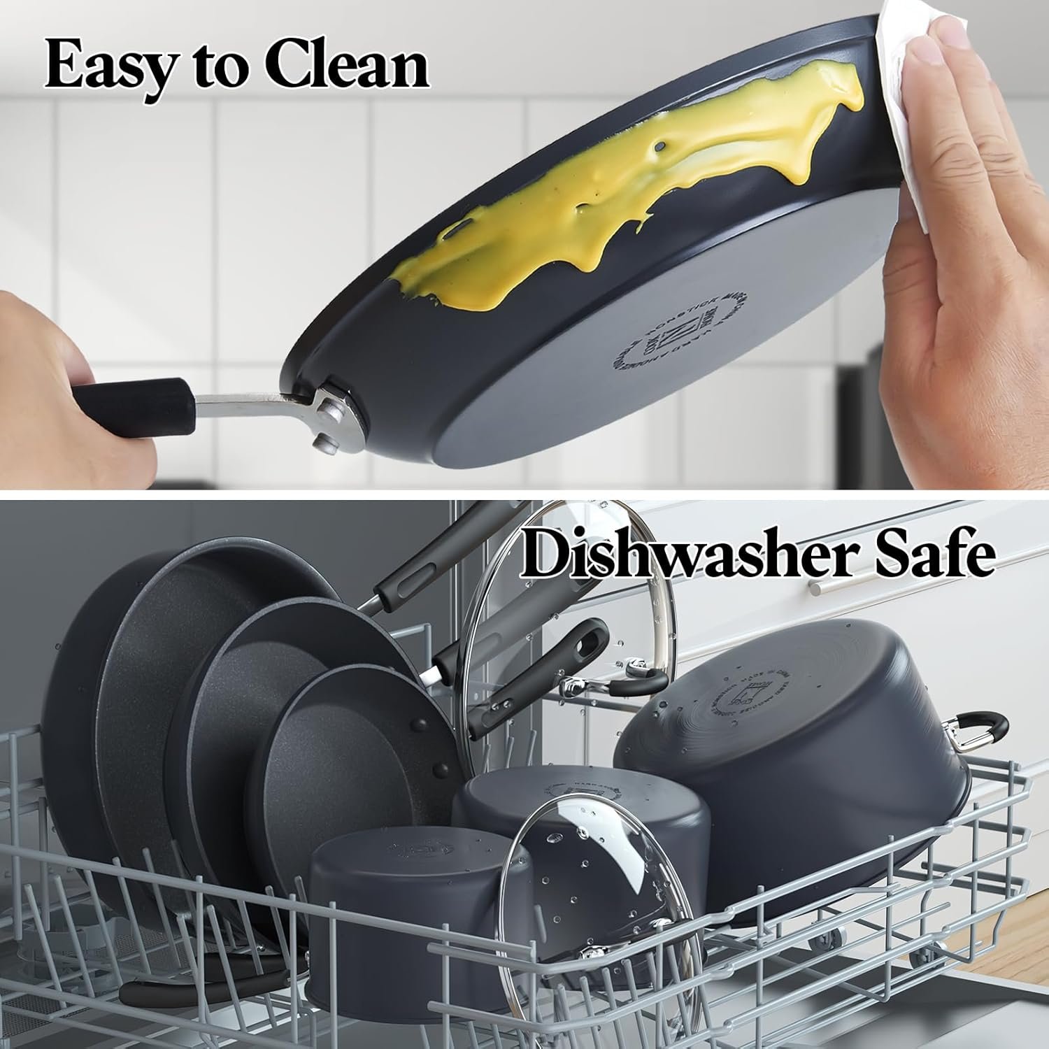 The Cook N Home Professional Hard Anodized Nonstick Pots and Pans 12-Piece Cookware Set features hard anodized aluminum construction, which provides fast and even heat distribution. The premium material used in this set is more durable and corrosion-resistant, and it won’t react to acidic foods. The non-stick hard-anodized aluminum body prevents food from sticking, allowing for easy food release and tossing, making cooking and cleaning a breeze.