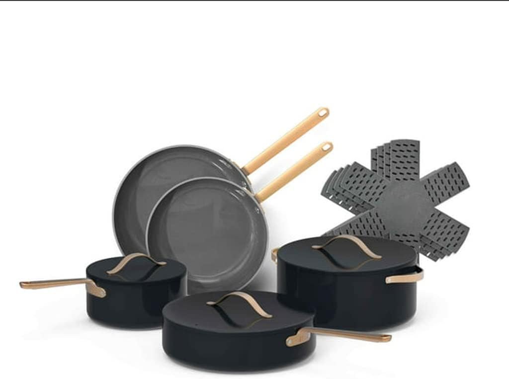 The 12-piece cookware set is designed with a healthy ceramic non-stick coating that is free from PTFE, PFOA, and PFOS, ensuring a safer cooking experience. This cookware set is constructed for durability and features a sleek design with gold die-cast handles, adding a touch of elegance to any kitchen.