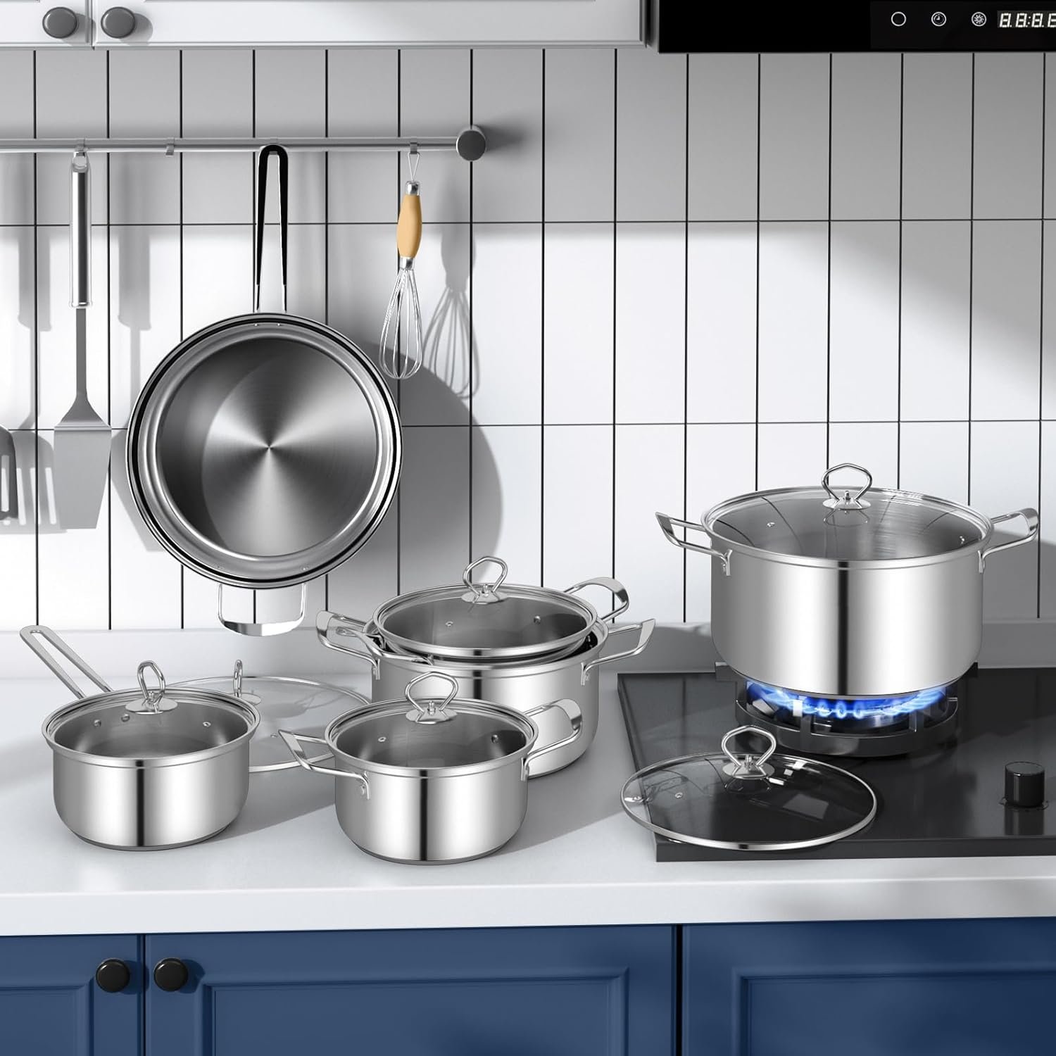 - 12-piece cookware set featuring 4 stockpots (7/4.5/4/3 QT), a 10″ frying pan, and a 2.5 QT saucepan