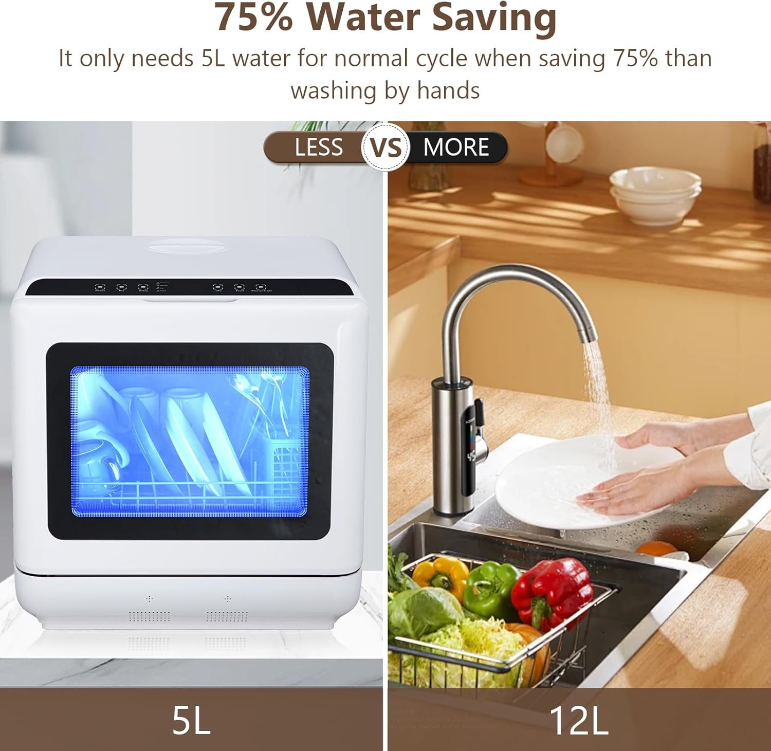 The compact countertop dishwasher is crafted to provide a thorough dishwashing experience and deliver spotless results. With its compact size, large capacity, and 2 water supply options, it is perfect for small homes, apartments, dorms, boats, and campers/RVs. The 5 versatile wash and dry options, 3-in-1 function, and 360° cleaning make it a great addition to any kitchen.