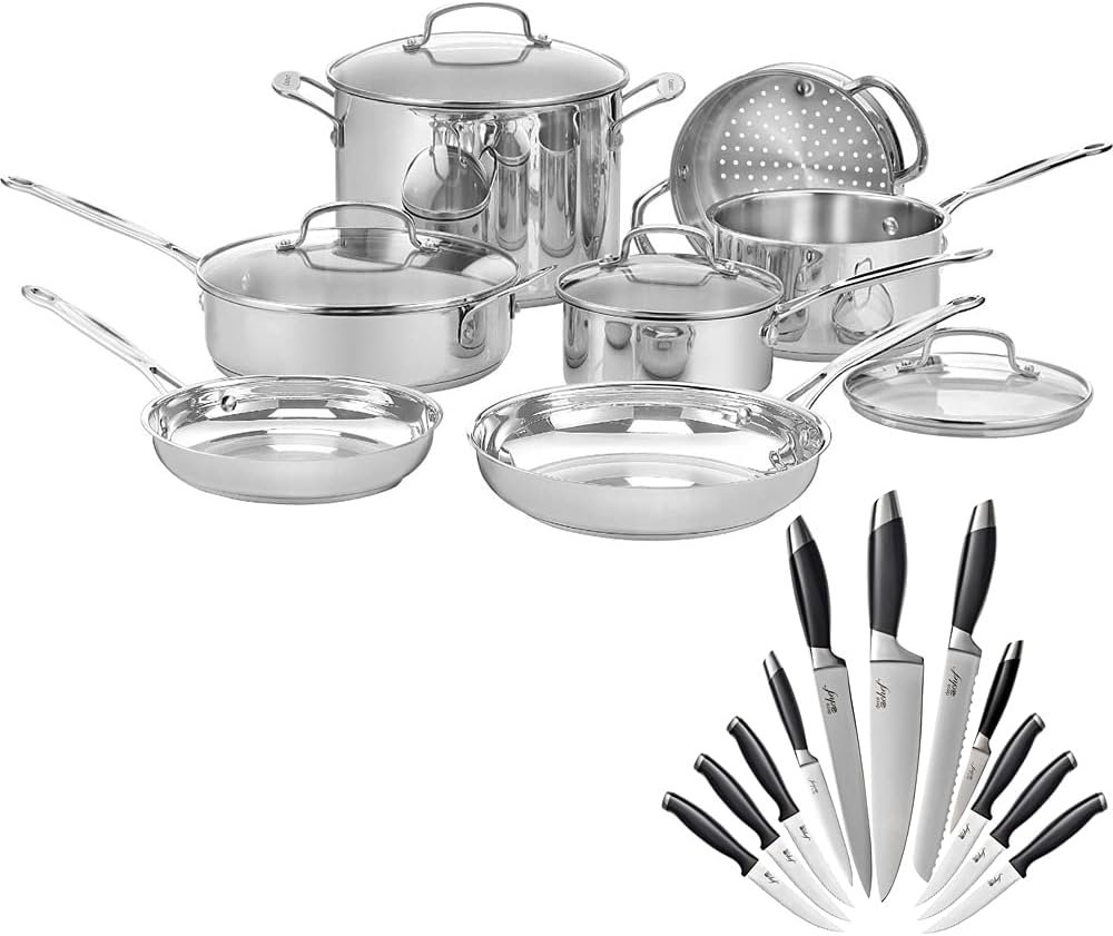 Cuisinart 77-11G Chef’s Classic Stainless 11-Piece Cookware Set Bundle with Deco Chef Gourmet 12 Piece Stainless Steel Knife Set with Storage Block