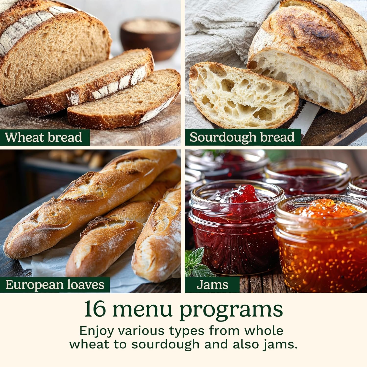 • 16 menu programs to bake various types of bread and other baked goods