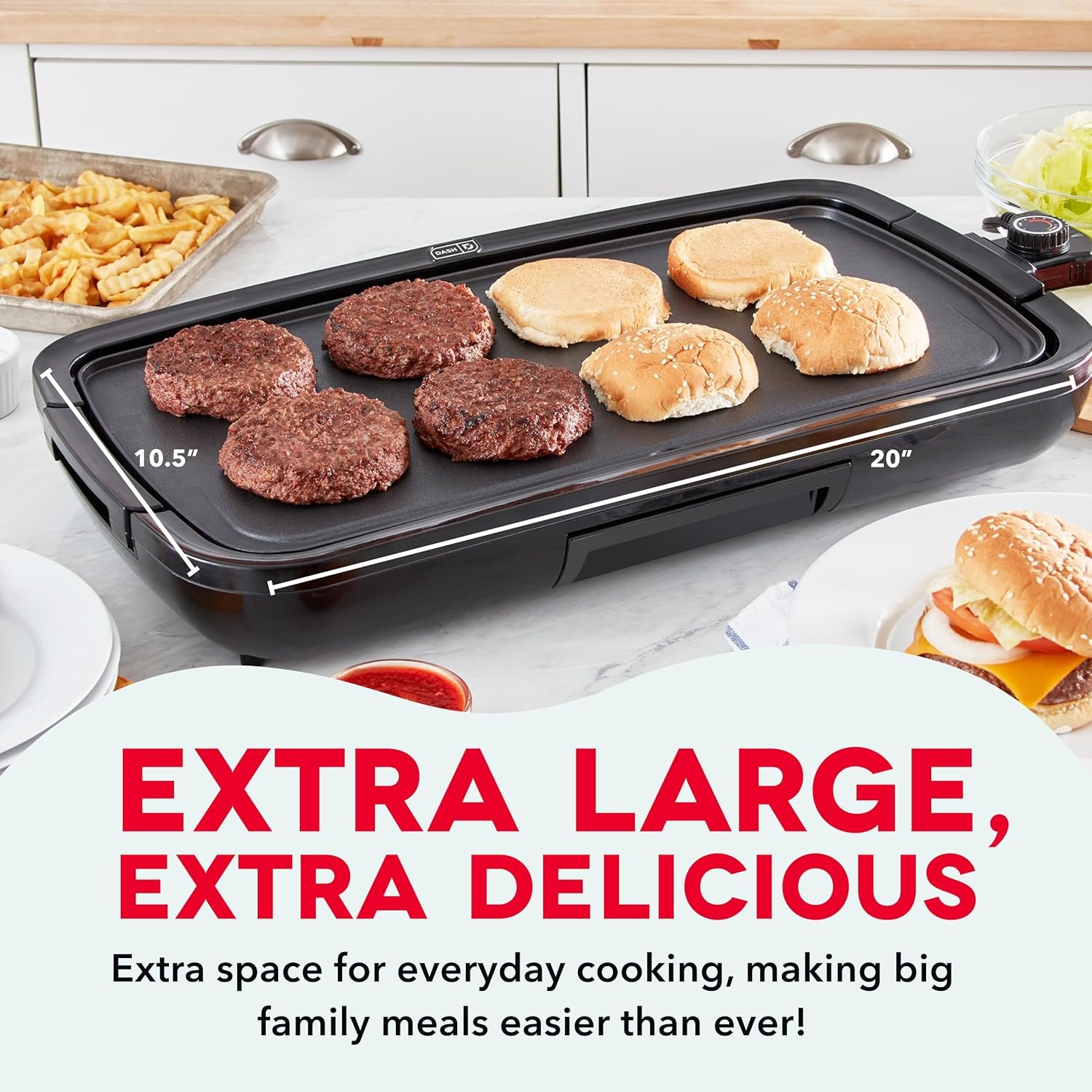 Make delicious meals the whole family will enjoy with the DASH Deluxe Everyday Griddle. Whether you’re cooking pancakes, burgers, or Korean BBQ, the Everyday Griddle makes preparing your favorite meals more convenient than ever. The 20 x 10.5 inch surface heats quickly, saving time and energy, while the Heating Probe gives you precise control over your cooking temperature.