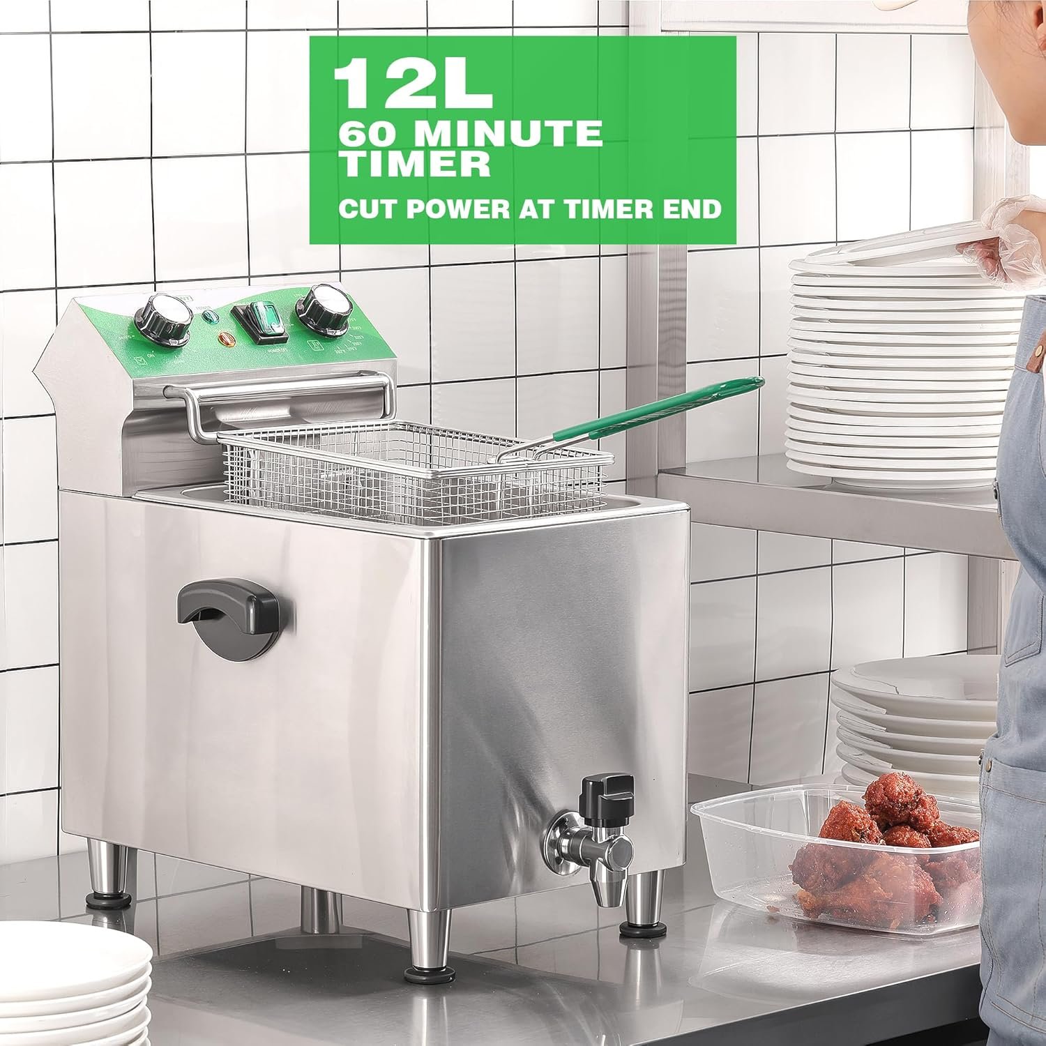 Deep Fryer with Basket and Lid Commercial Fryers with Oil Filtration and Timer 12L/12.7QT Electric Countertop Fryer Stainless Steel Single Tank Fryer for Home and Reastaurant Use 110V 1750W