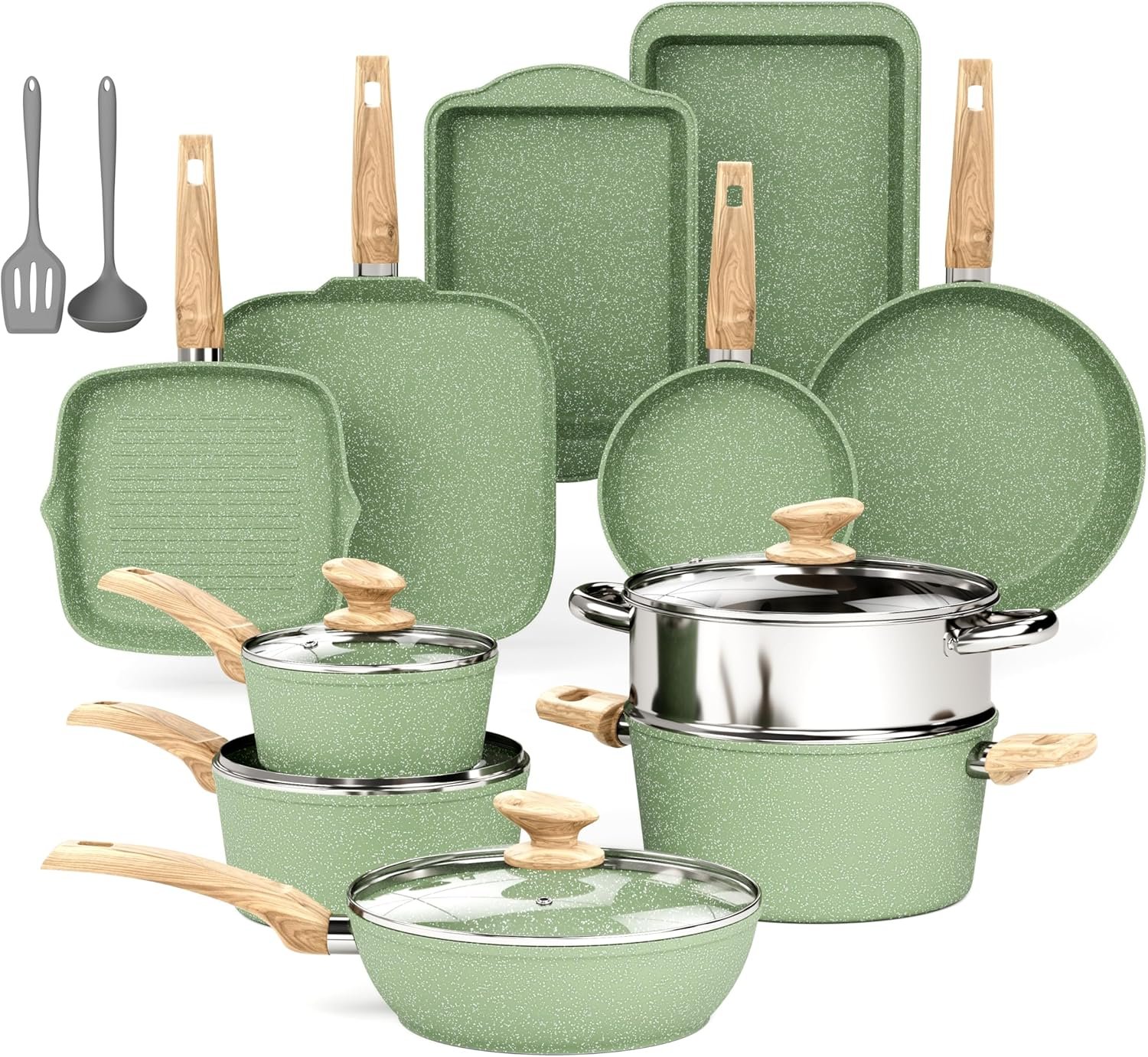 DishDelight Pots and Pans Set Non Stick, 17 Pieces Granite Kitchen Cookware Sets with Nonstick Granite Coating, Induction Cooking Set for Present, Green
