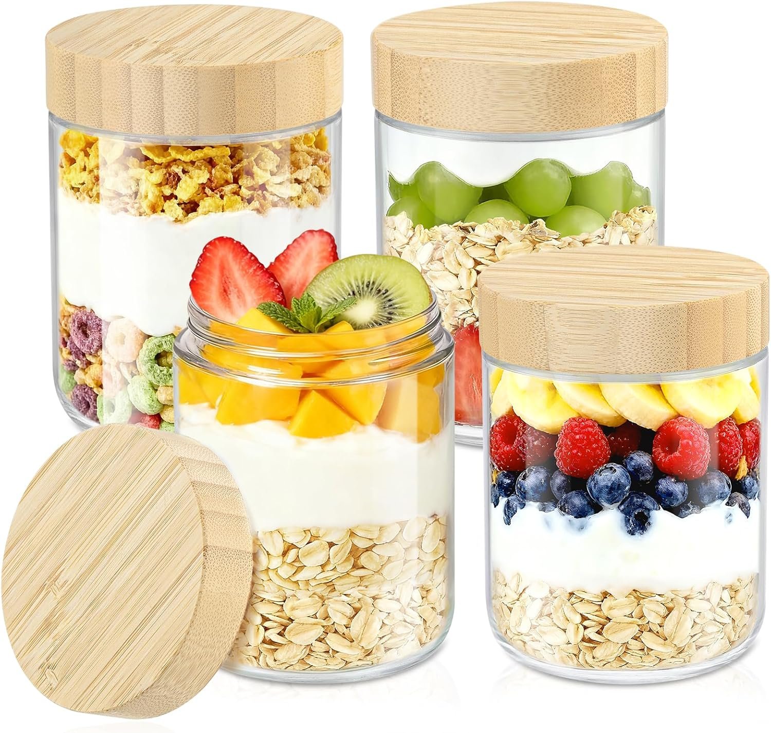 DRKIO 16 Oz Overnight Oats Containers with Bamboo Lids – 4 Pack Glass Storage Jars with Airtight Lids Wide Mouth Mason Food Jars Great for Meal Prep Salad Chia Pudding Snacks Yogurt Sugar Spice Cereal