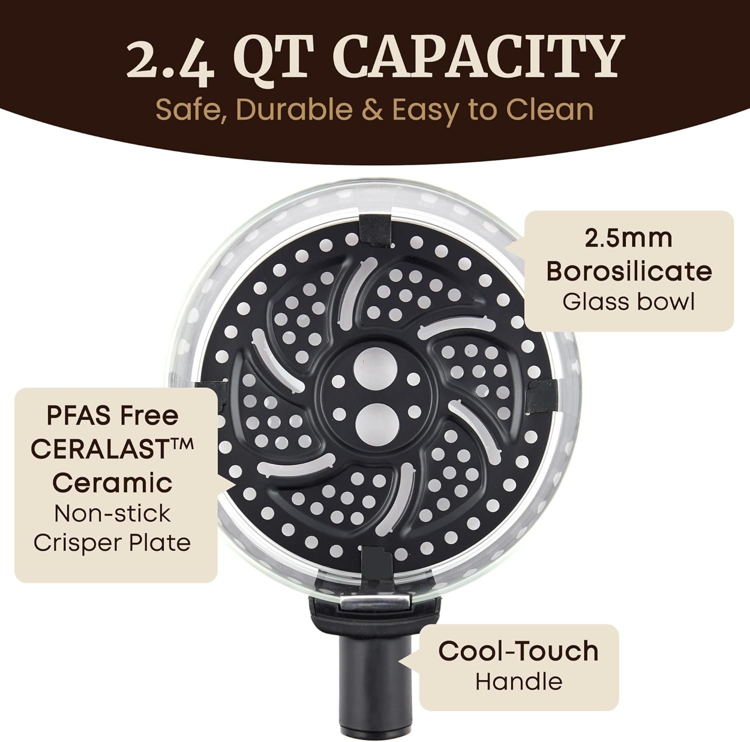 • Easy-to-clean glass bowl and Ceralast PFAS-Free ceramic-coated air fry rack