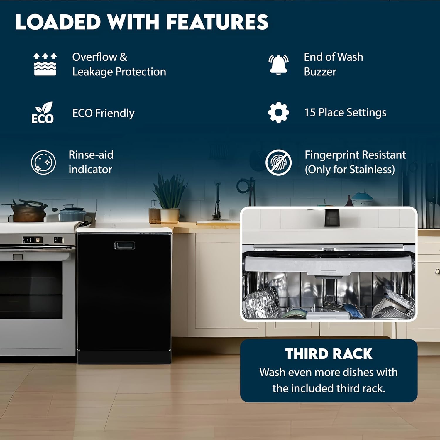 • 15-place setting capacity + third rack for small utensils and odd-sized tools