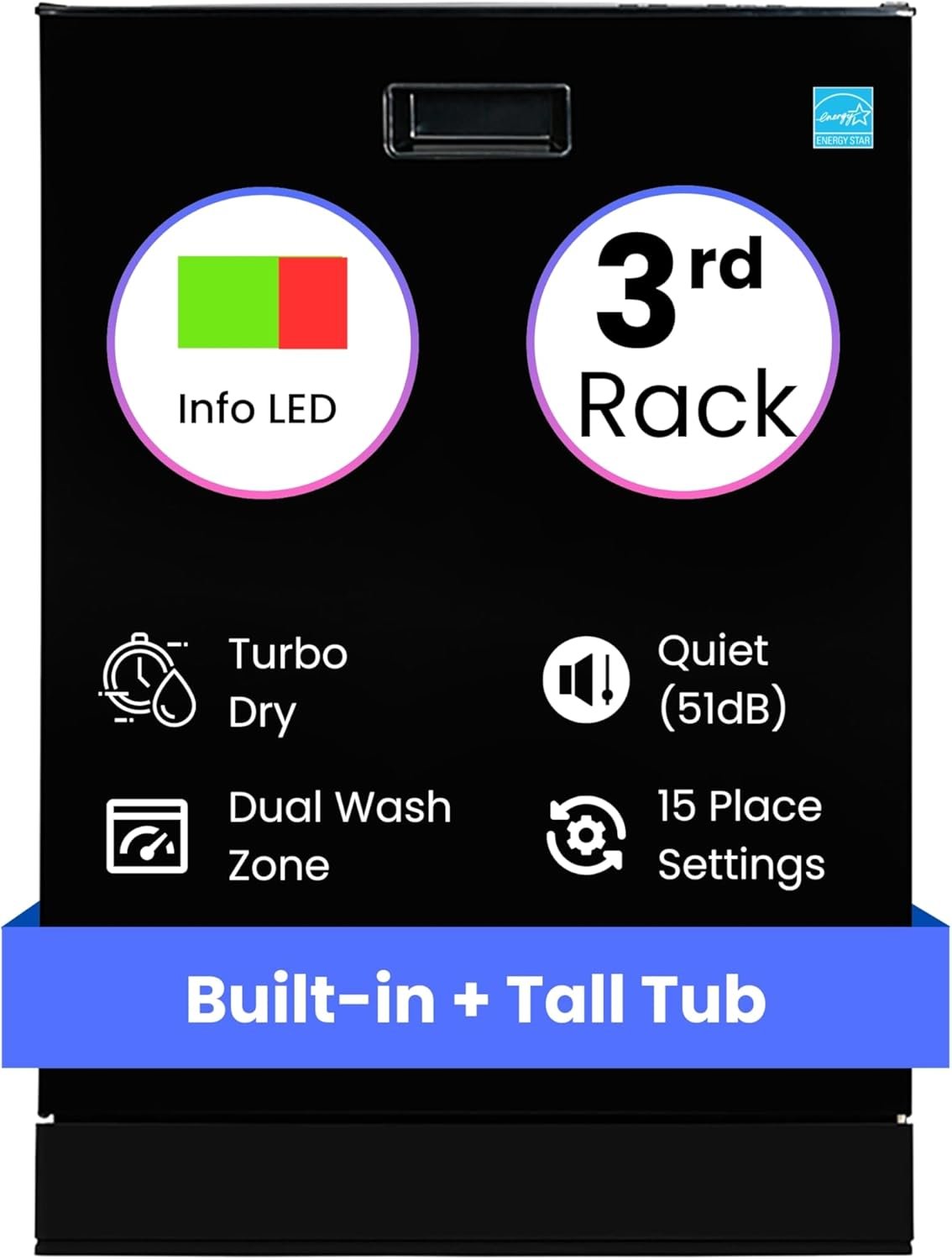 Home Dishwasher Equator 24″ Built in Tall Tub Dishwasher 15 Place 3rd Rack 8 Wash 1400 RPM Turbo Dry 110V E-Star