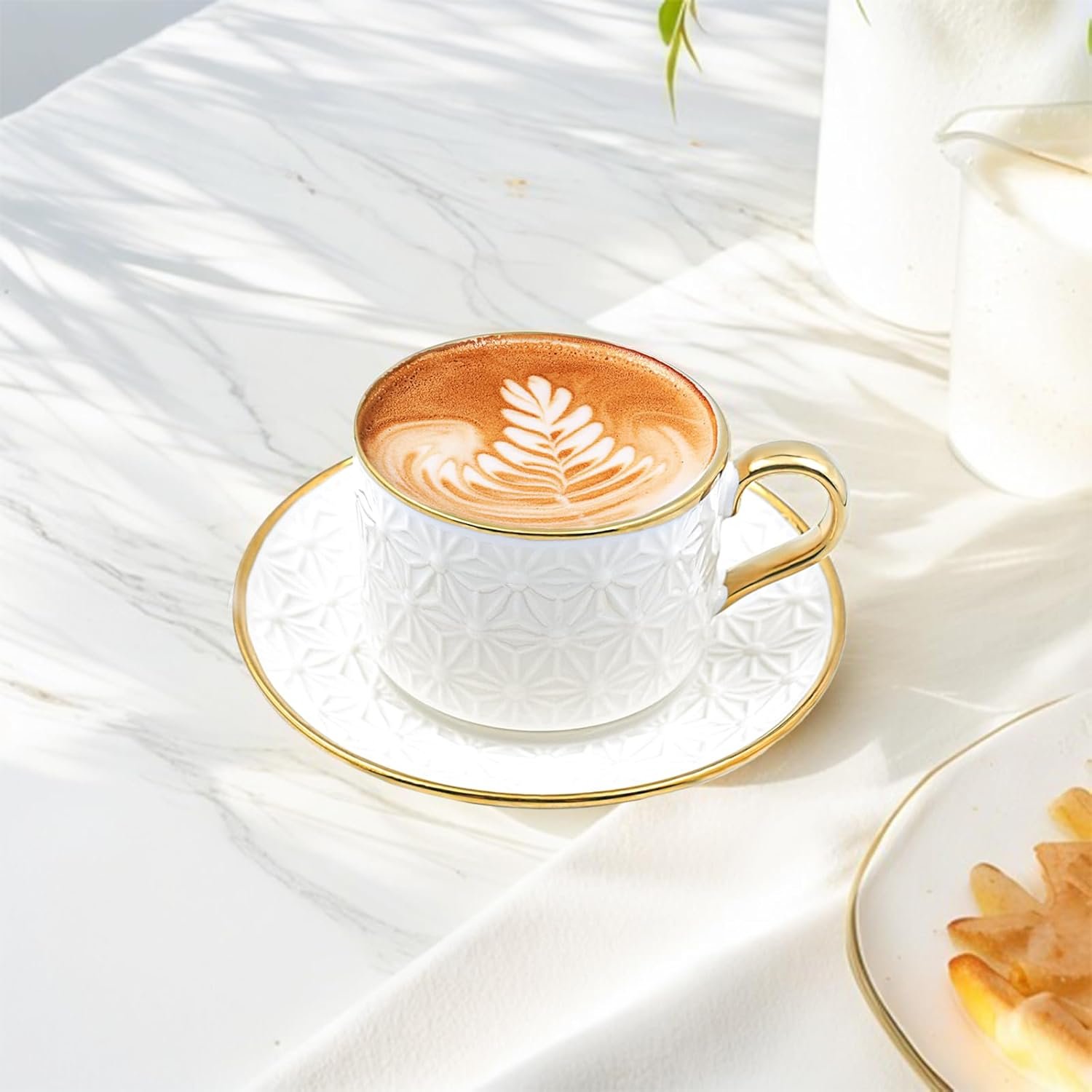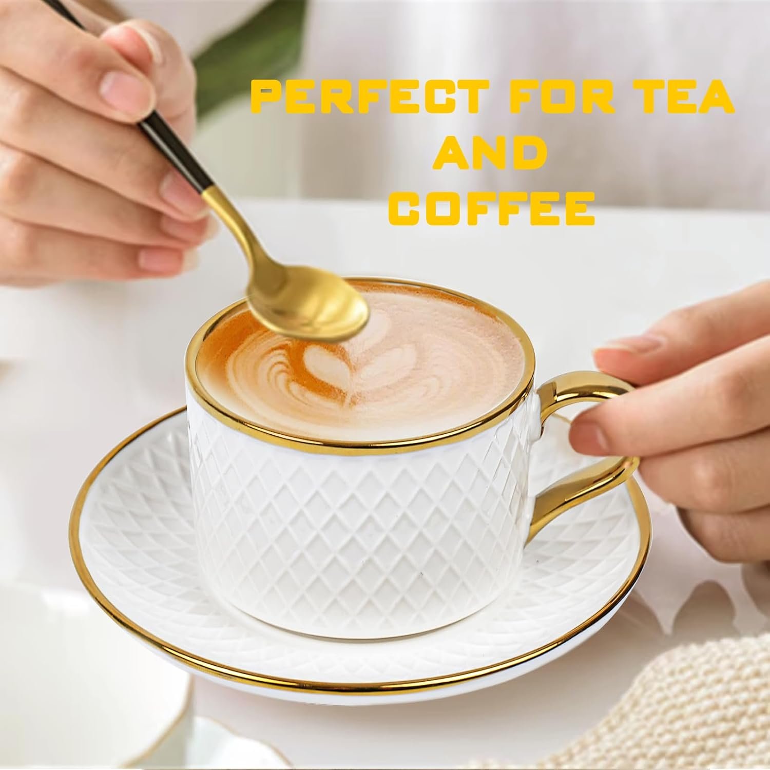 This espresso cups set consists of 6 coffee cups and 6 saucers, made of high-quality ceramic material. The traditional coffee cup shape is paired with a unique plaid embossing, and the edge is embellished with gold to make the cup more delicate and suitable for daily use in the home or office. Each cup has a capacity of approximately 7 ounces and can hold a variety of hot drinks, including cappuccino, latte, chocolate, and hot milk.