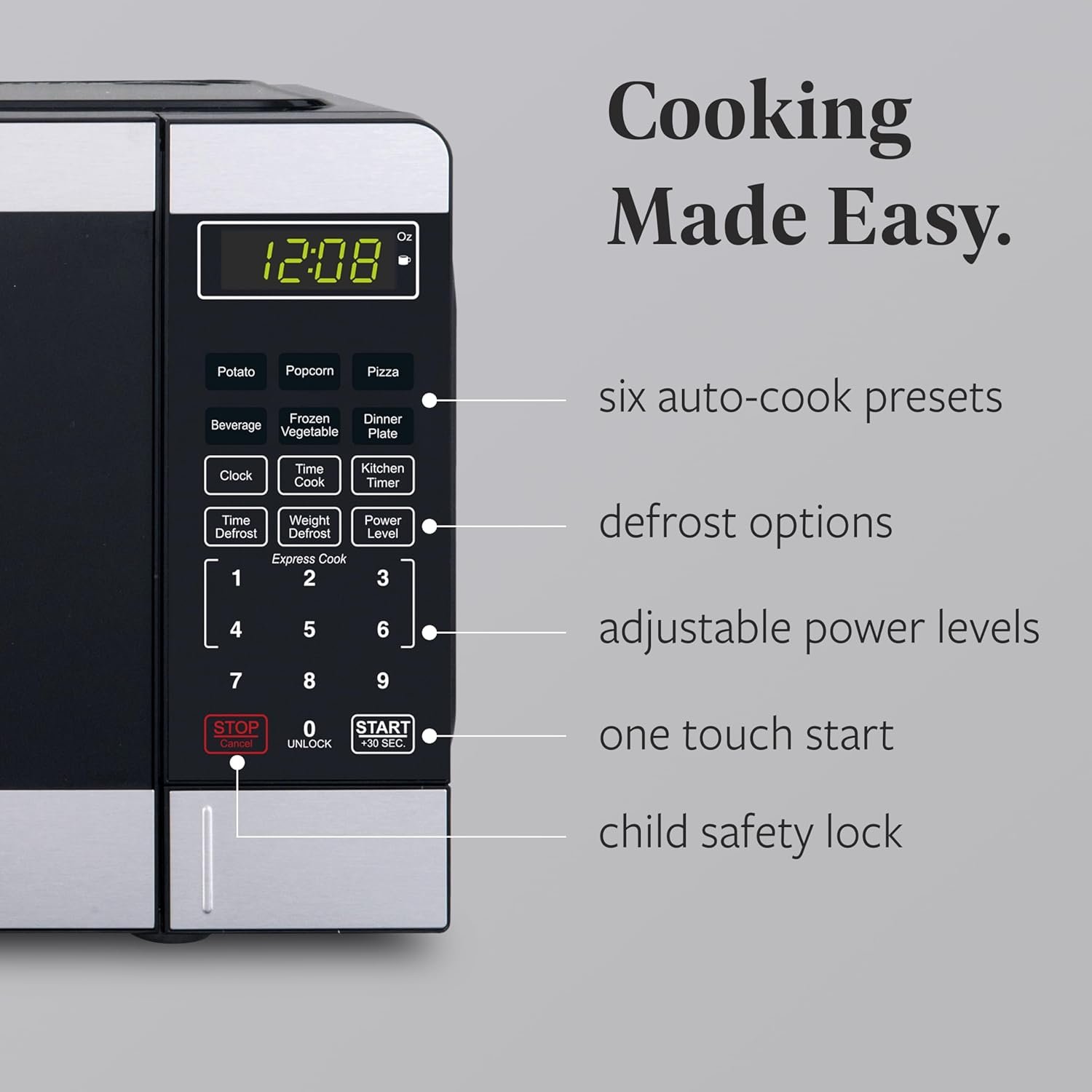 • Easy-to-use controls with a clear LED display, express cooking, defrost options, and a convenient +30-second button for quick adjustments