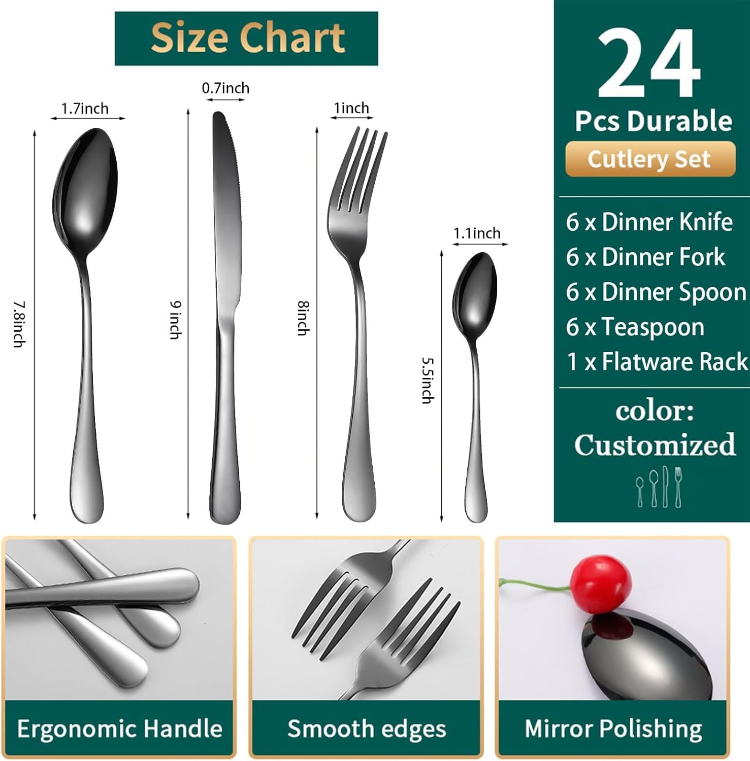 - Silverware Set For 6: Includes 6 spoons, 6 forks, 6 knives, 6 coffee spoons, and 1 gold silver tableware rack