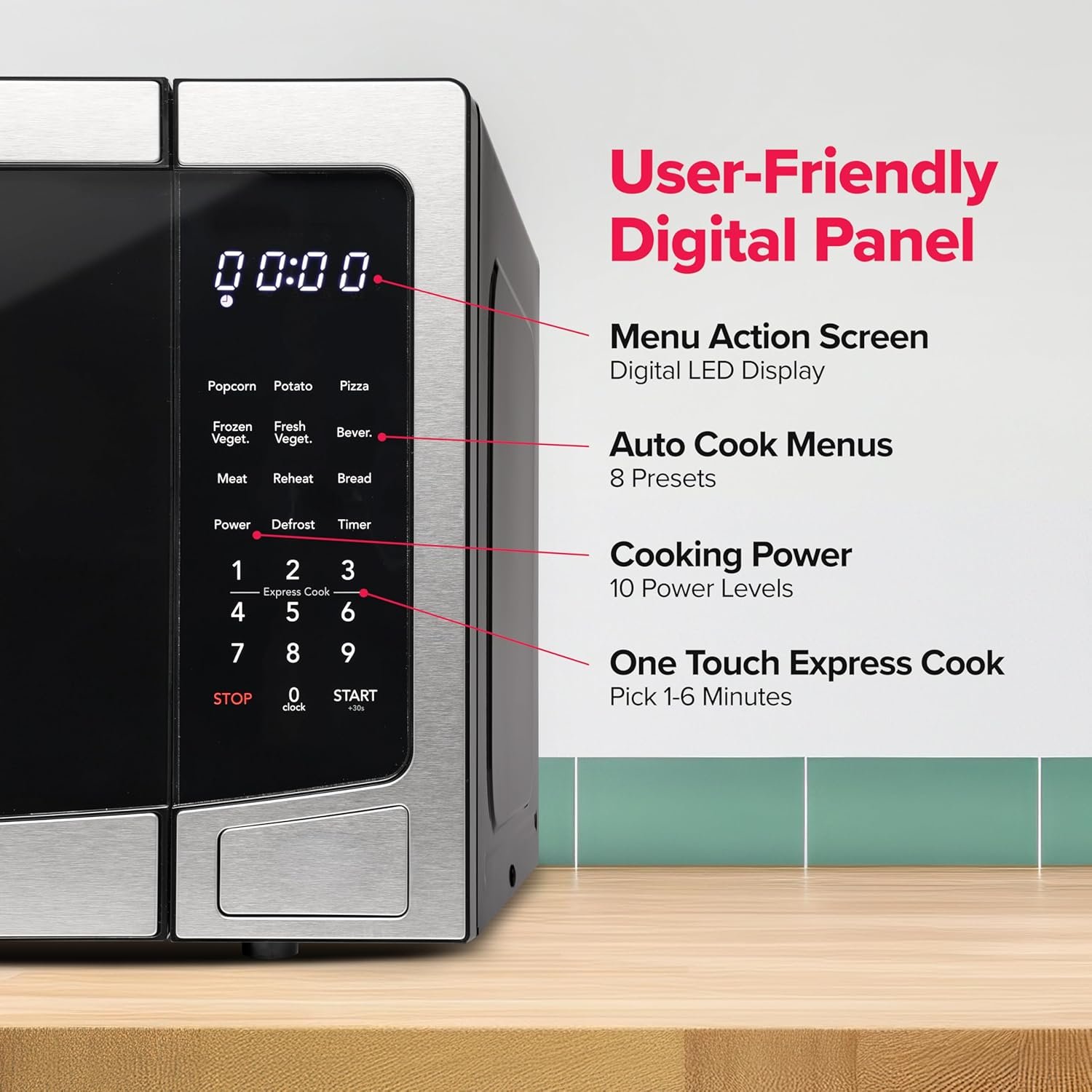 The microwave features a sleek mirror finish with an electronic touchpad and a convenient auto-cook menu. The digital display includes a clock and a kitchen timer, making it easy to keep track of cooking time and schedule meals.