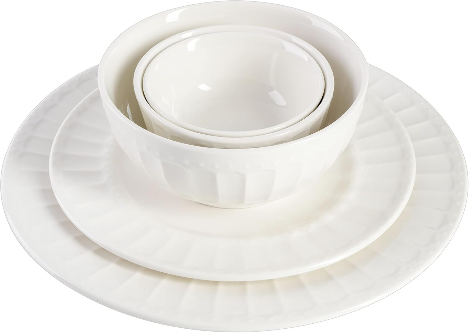 Bring a classic look to your home with the Gibson Home Gracious Dining 40 Piece Embossed Dinnerware Set. The set’s classic whiteware look means it is easy to match with a wide variety of table settings, and an elegant embossed finish adds style to every piece. No matter if you are enjoying a family dinner or entertaining guests, this white dinnerware set is a go-to choice for value, durability, and elegance.