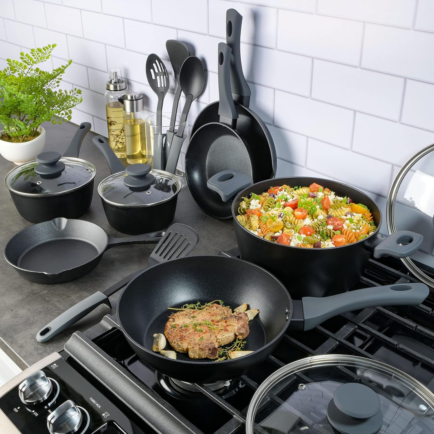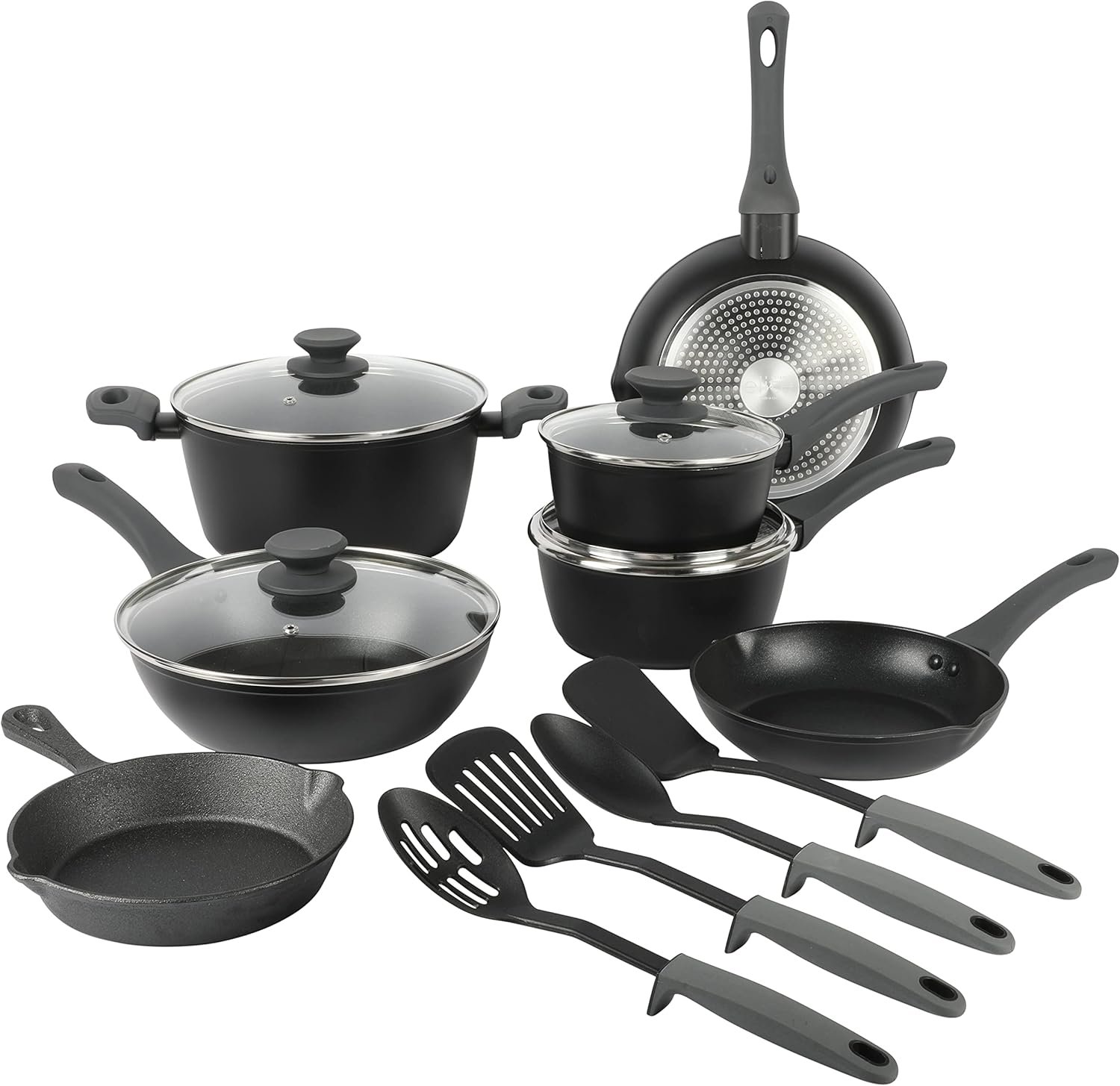- Convenient extra features, including a cast iron skillet and tempered glass lids