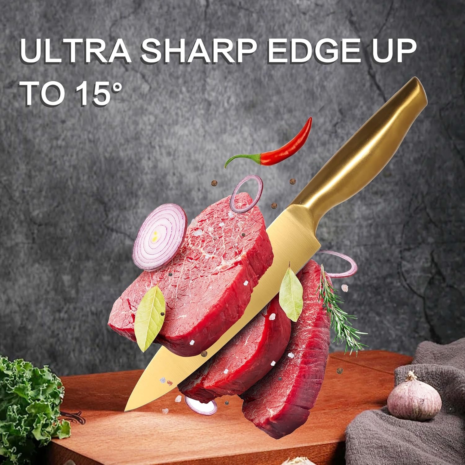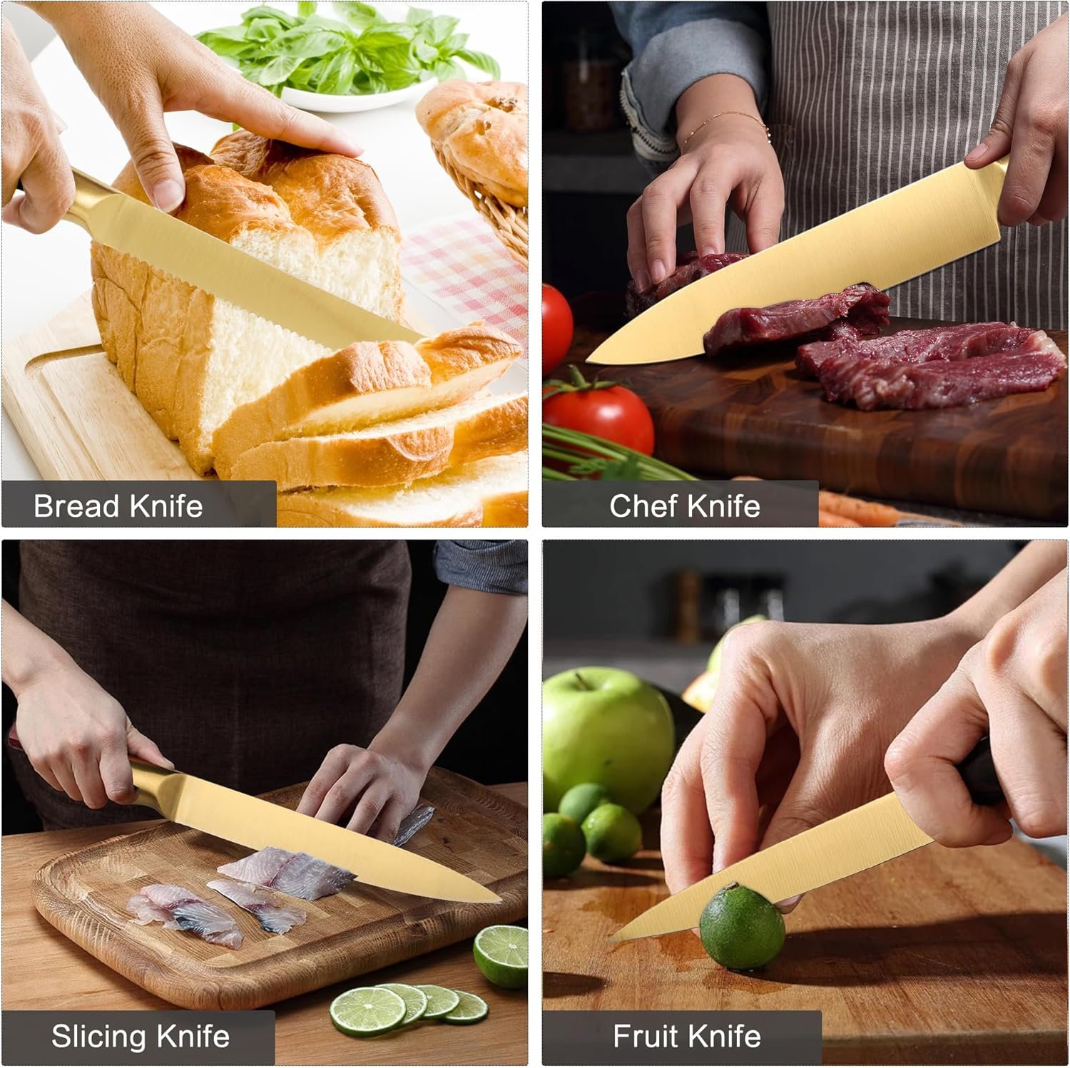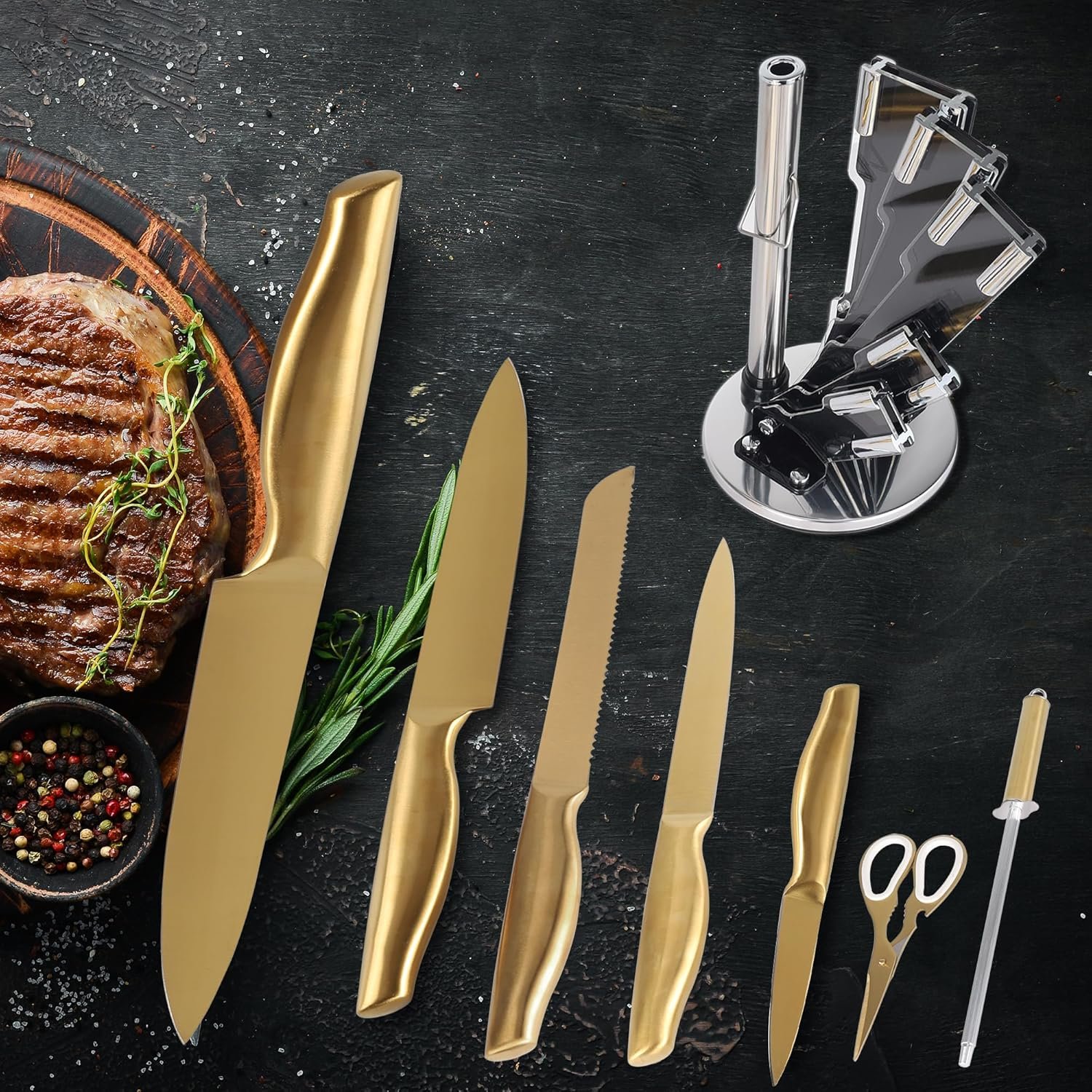 • Golden Titanium Blade: The knives are made of high-quality German stainless steel and coated with a gold titanium coating, which prevents the steel from oxidizing and rusting. The titanium coating also improves corrosion resistance and enhances non-stick properties.