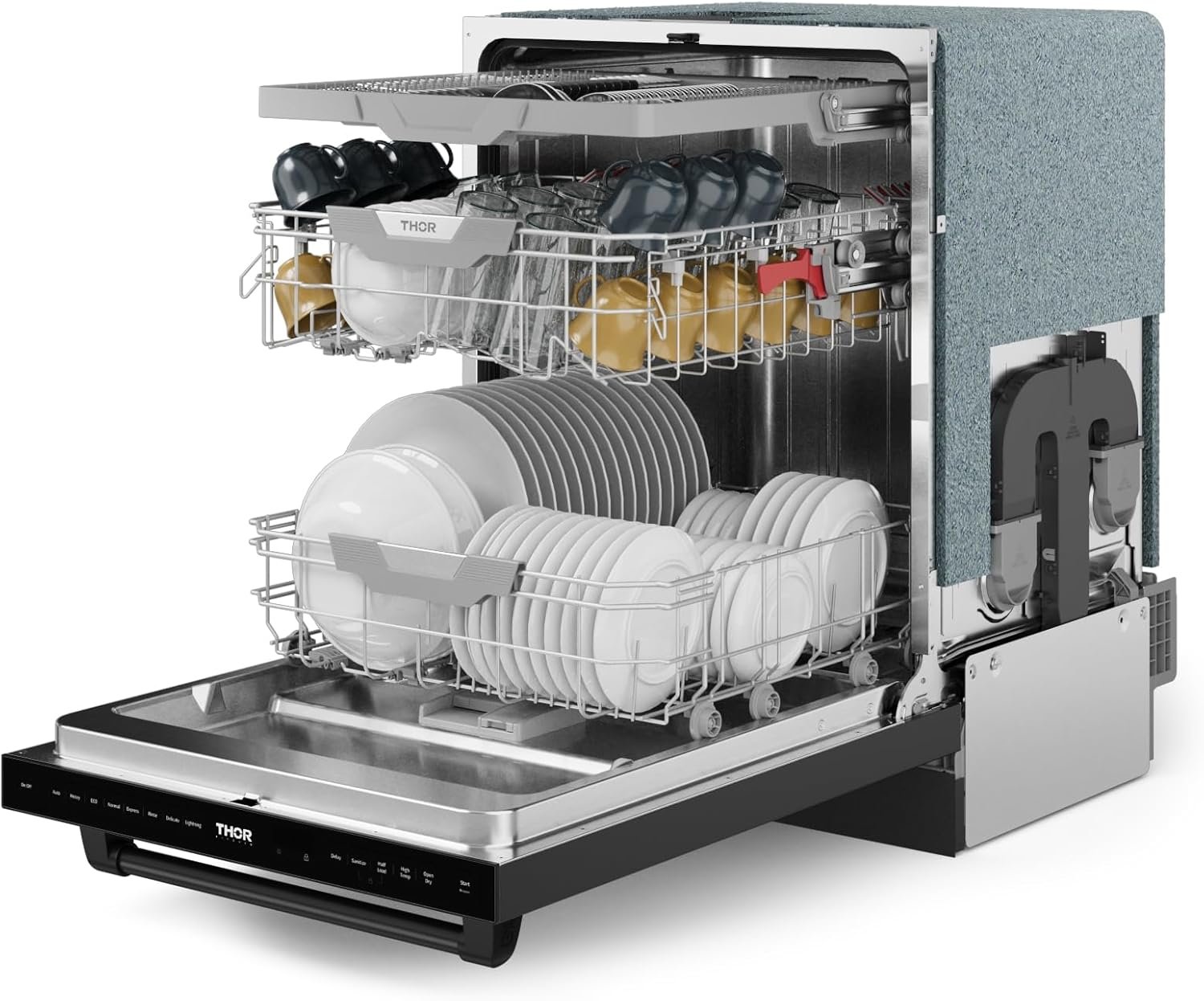 • Three-Tiered Spray Arms: Equipped with top, upper, and lower spray arms, this dishwasher delivers comprehensive coverage, thoroughly cleaning every dish from all angles.