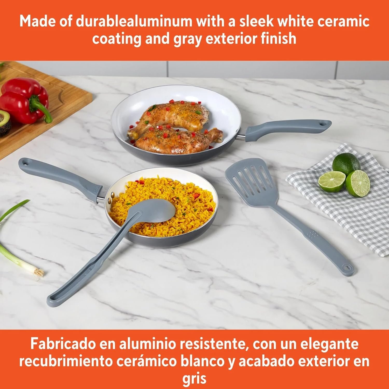 The 4pc White Ceramic Value Aluminum Cookware Set in Gray is an excellent choice for anyone looking to enhance their kitchen with versatile and high-quality tools. This set includes two different-sized fry pans, along with a slotted turner and a solid spoon, providing everything you need for a variety of cooking tasks and easy serving.