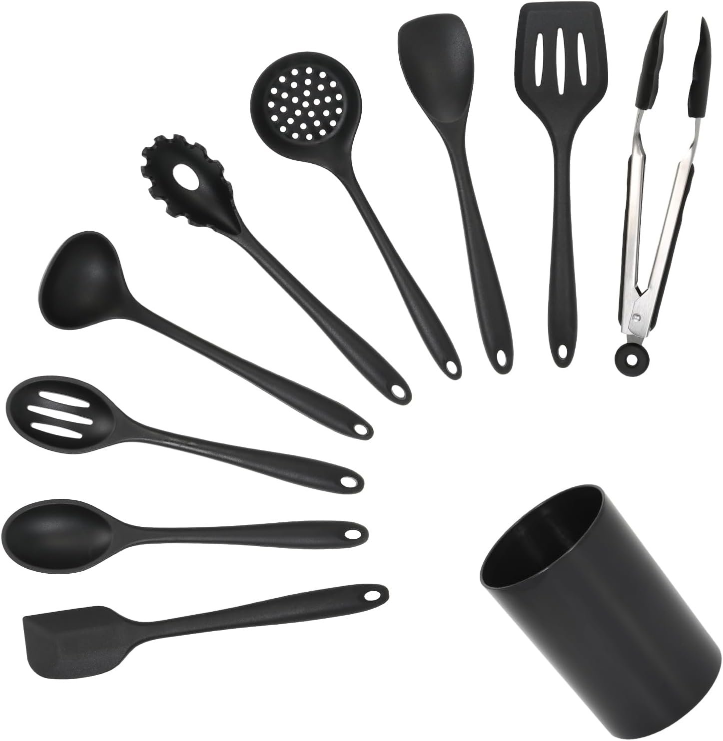 Our cooking utensils set includes 10 essential items: slotted turner, deep soup ladle, skimmer, spoon spatula, slotted spoon, pasta server, solid spoon, flexible spatula, kitchen tongs, and holder. This set is perfect for all cooking lovers and is suitable for family everyday cooking, baking, stirring, frying, and mixing.