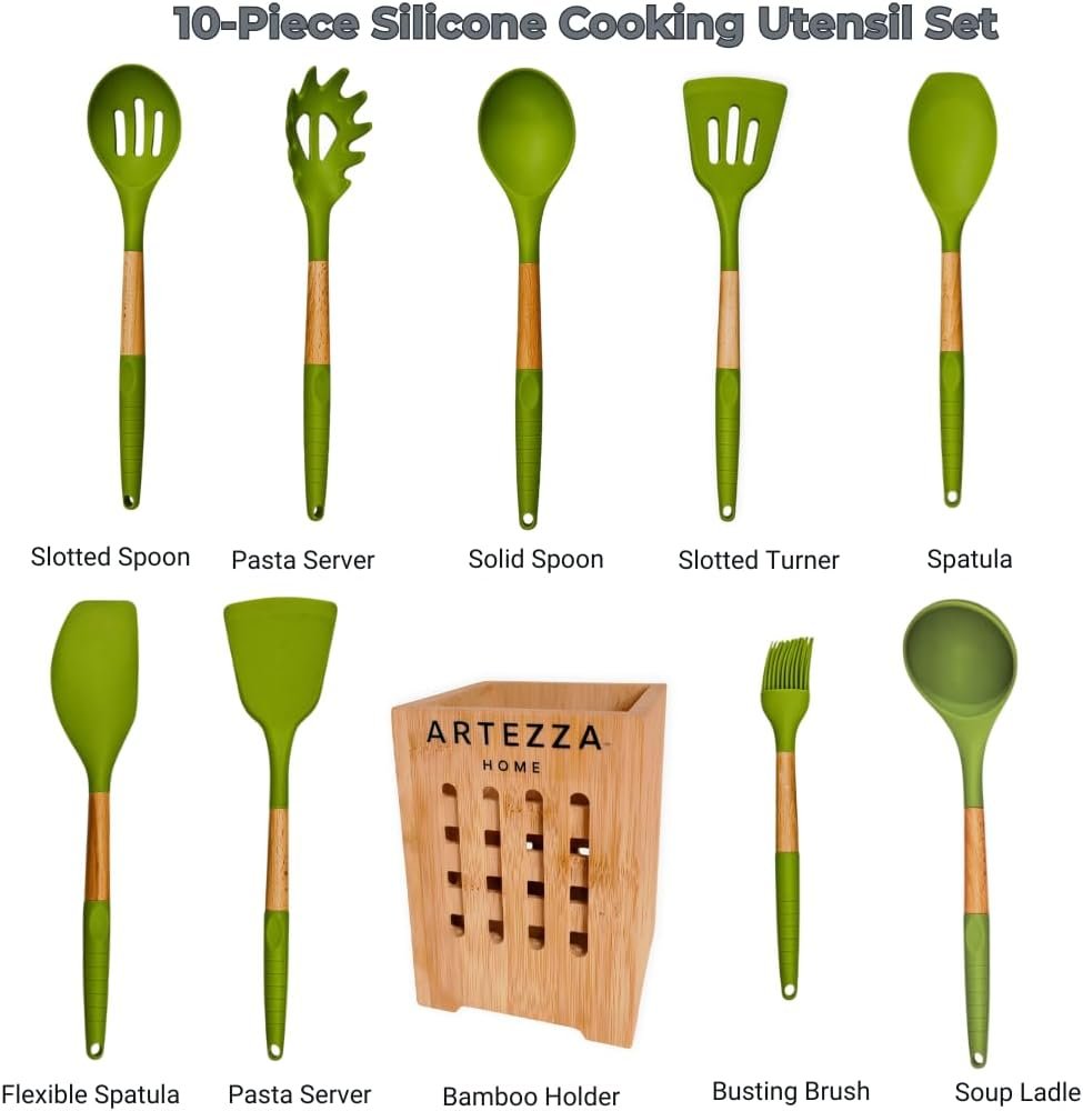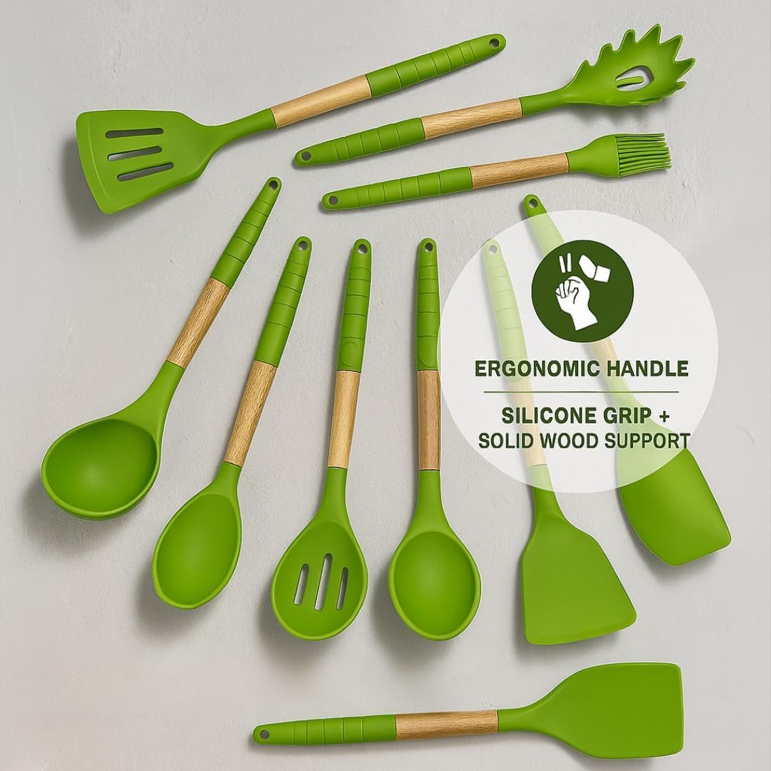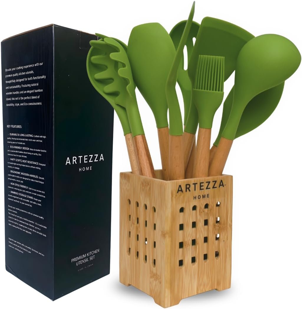 We offer two beautiful color sets to complement any kitchen – green and black. More color variations are coming soon as we continue to grow our collection. Every set features premium silicone utensils with natural acacia wood handles and a matching holder designed to elevate your space.