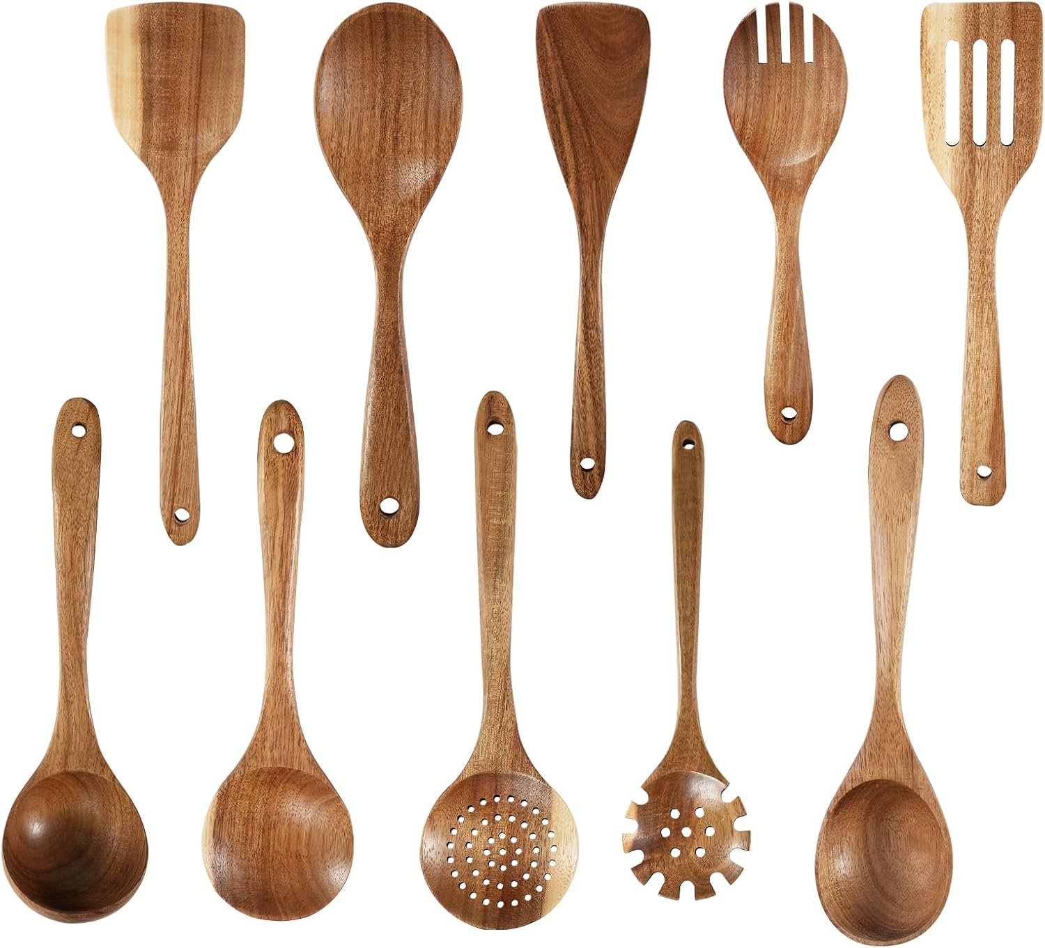 Handcrafted from durable acacia wood, these kitchen utensils offer natural beauty and long-lasting performance for everyday cooking. The 10-piece wooden utensil collection includes serving spoons and slotted spatulas for versatile cooking needs, making it perfect for any kitchen.