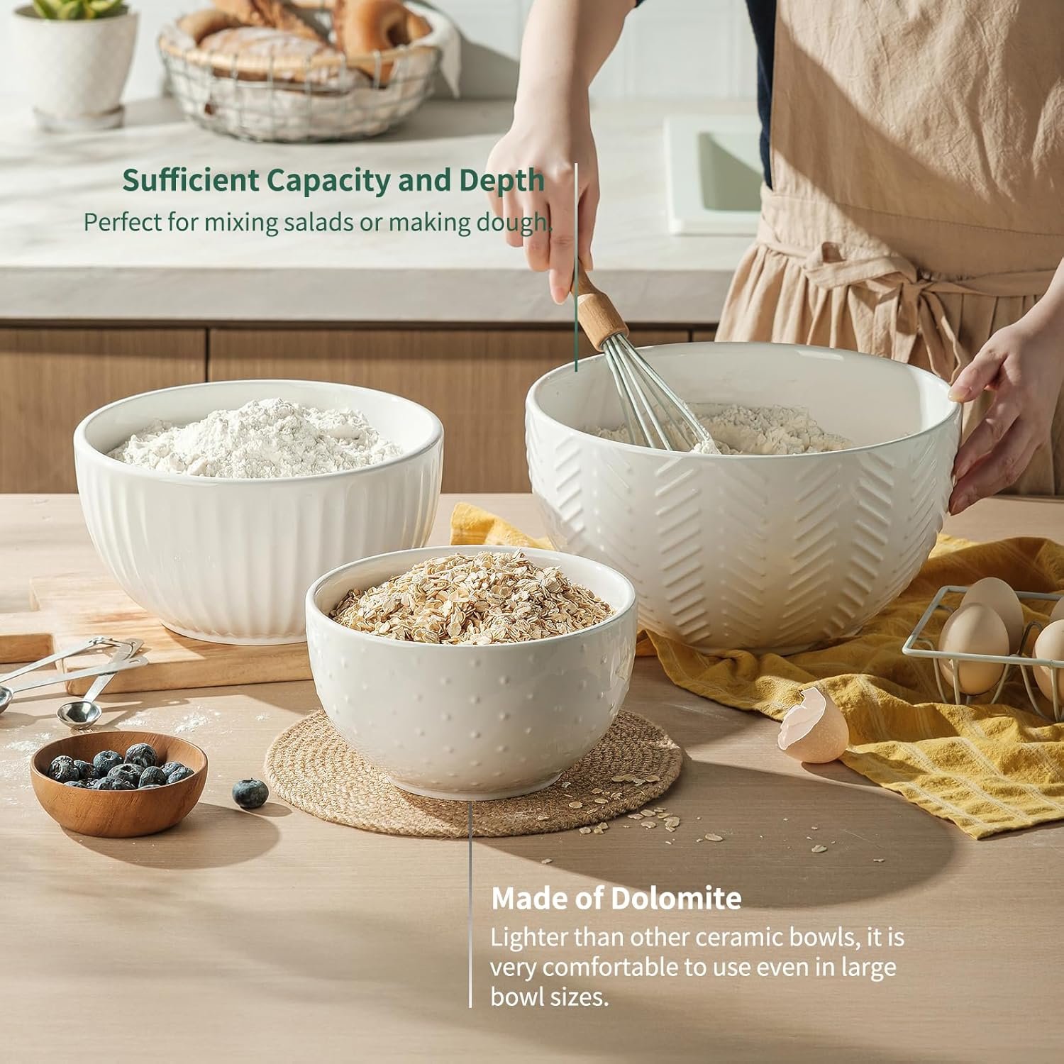 Our ceramic bowls are fired at high temperature, distributing heat more evenly than stainless steel bowls and maintaining a consistent temperature better. This is beneficial for certain recipes such as dough or cake batters. Made from lighter dolomite, they are lighter and stronger than other ceramic mixing bowls of the same size.