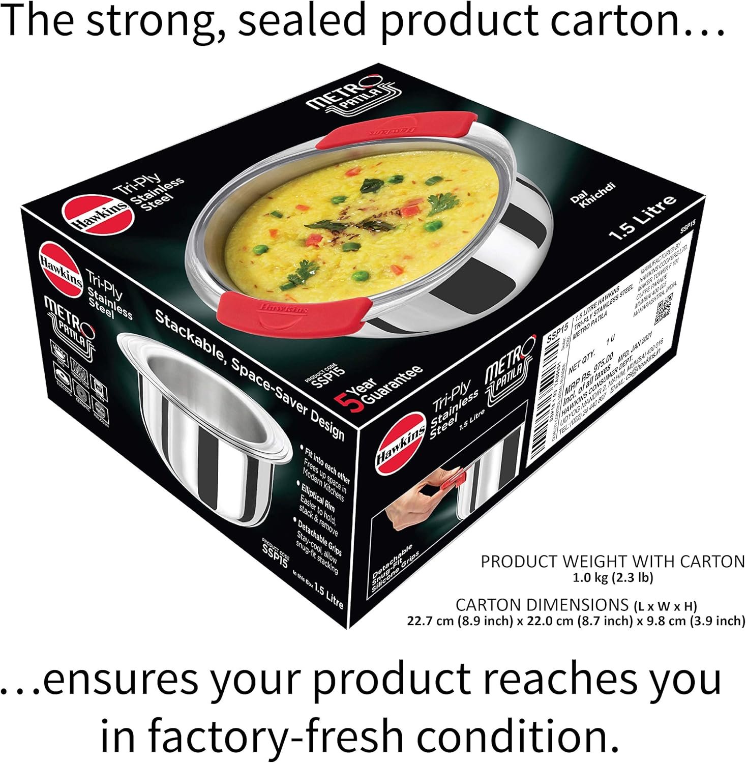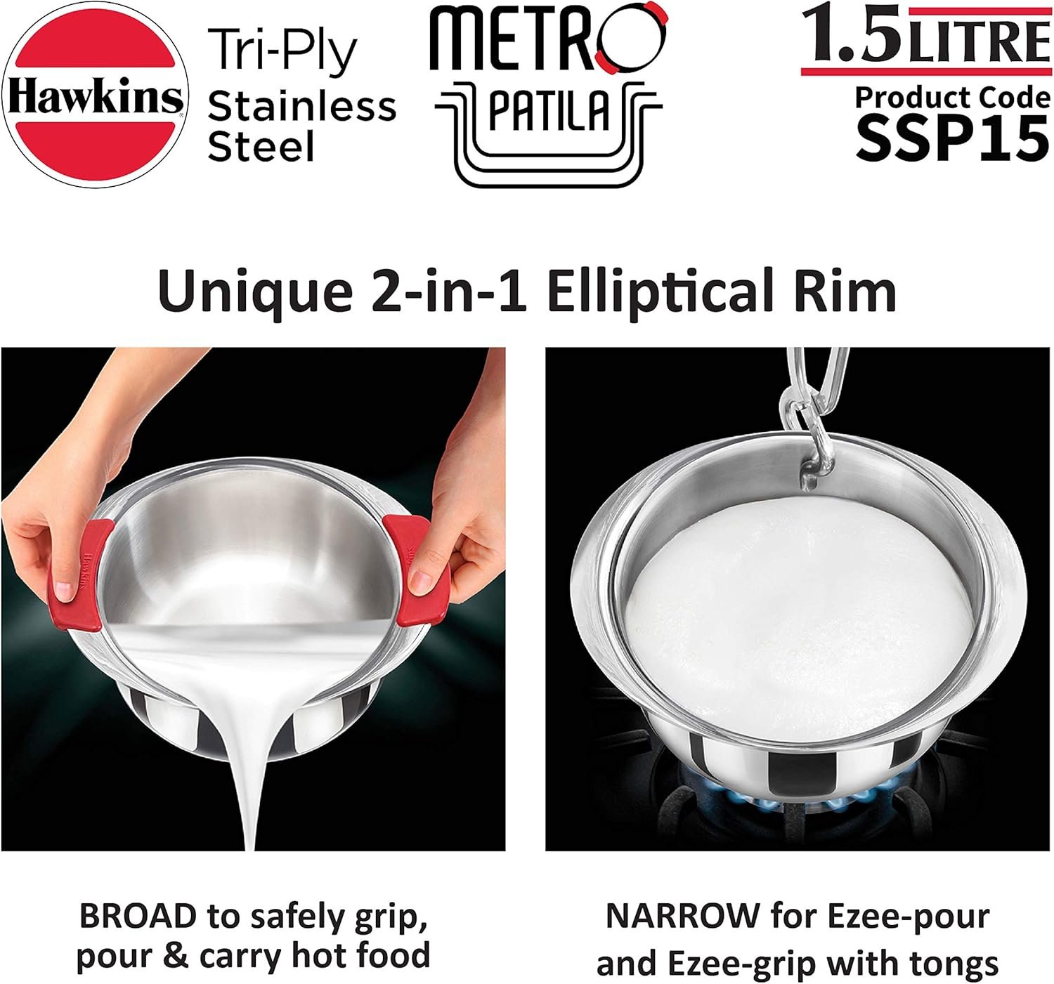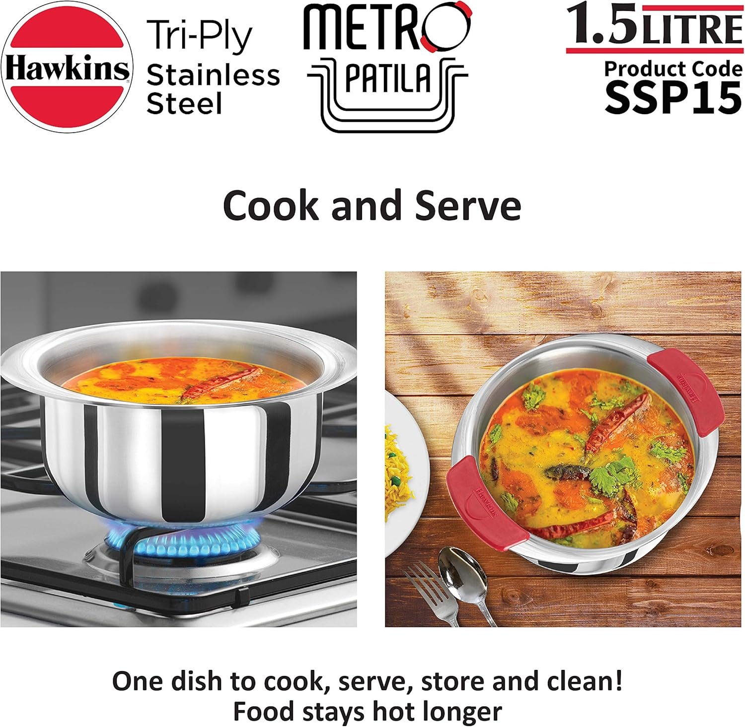 The Hawkins Tri-Ply Stainless Steel Metro Patila is perfect for cooking and serving a variety of dishes, including vegetables, dals, soups, sprouts, curries, and desserts. The food remains warm for a longer time, and there’s less to clean up, making it a convenient and practical choice for everyday cooking. With its unique design and features, this patila is a must-have for any modern kitchen.