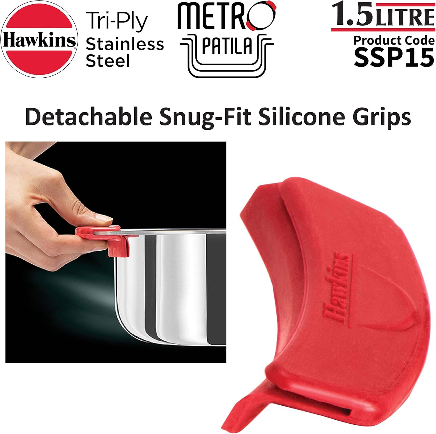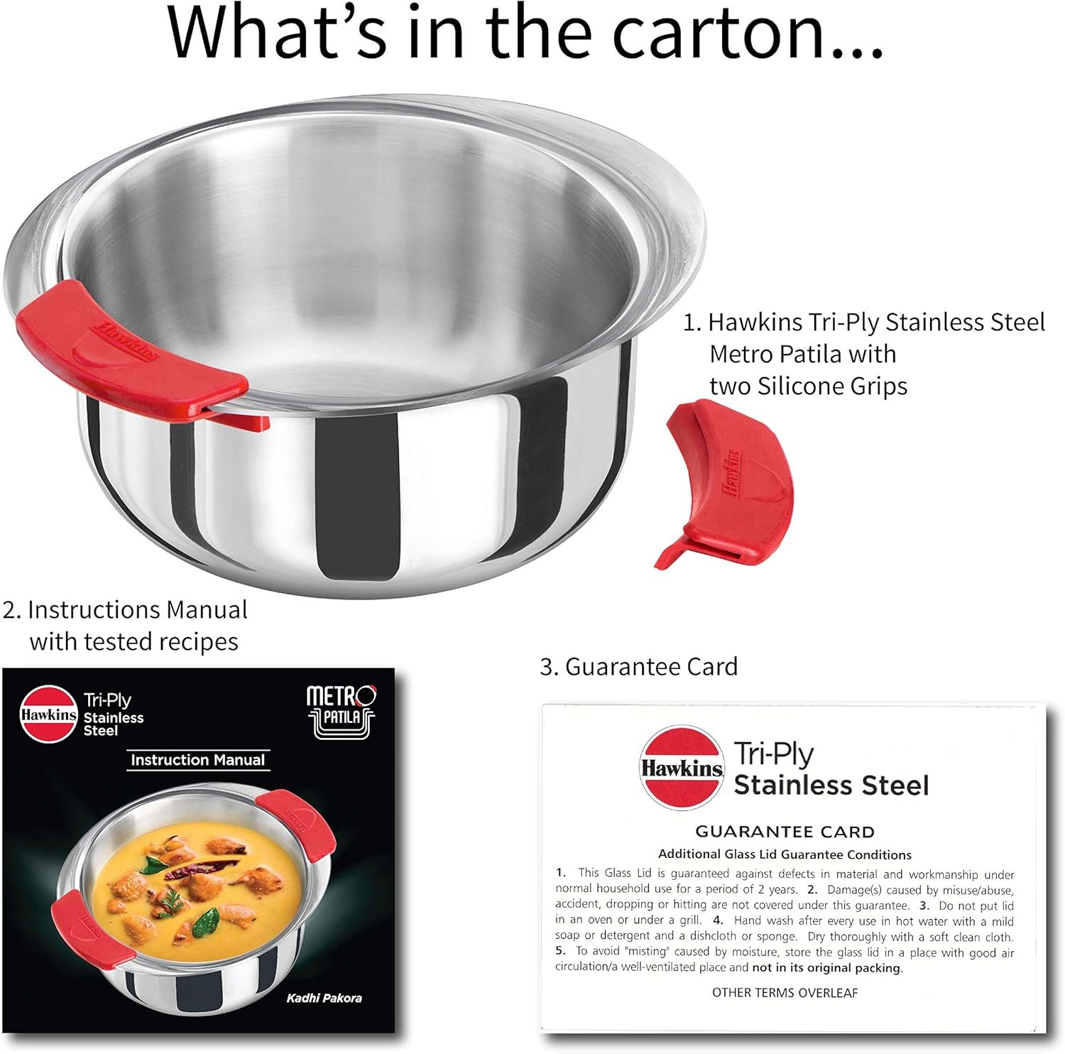 - 2.5 mm Thick Hawkins Tri-Ply Stainless Steel for even heat distribution and durability