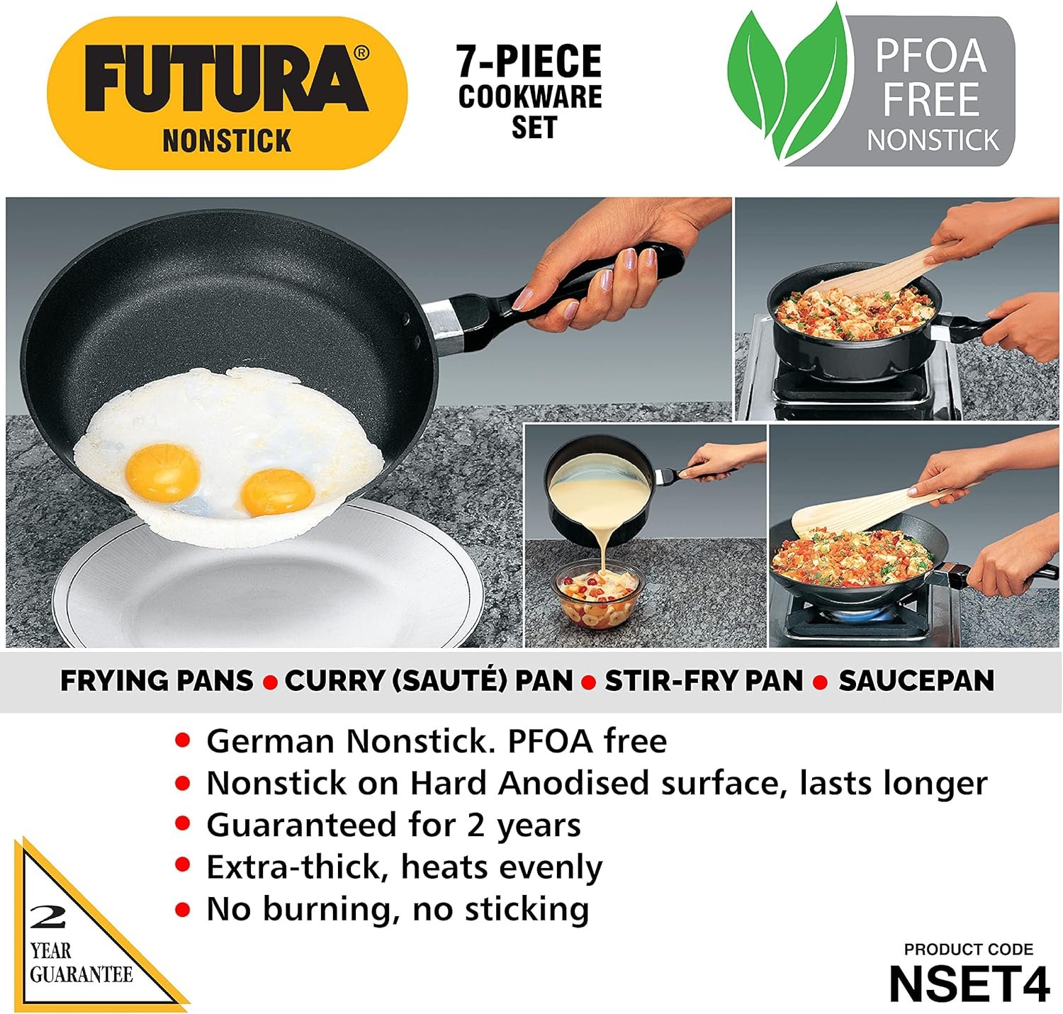 - Durable and Long-Lasting: The combination of PFOA Free Non-stick coating and Hard Anodised Aluminium ensures the cookware lasts longer.
