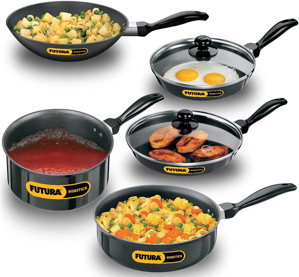 The Hawkins Futura 5 Pieces Cookware Set is a comprehensive collection designed to cater to a wide range of cooking needs. This set includes a Non-Stick Kadhai, two Frying Pans, a Saucepan, a Saute Pan, and two Glass Lids, all in black. The cookware is made with a PFOA Free Non-stick coating that is locked into tough Hard Anodised Aluminium, ensuring durability and longevity.