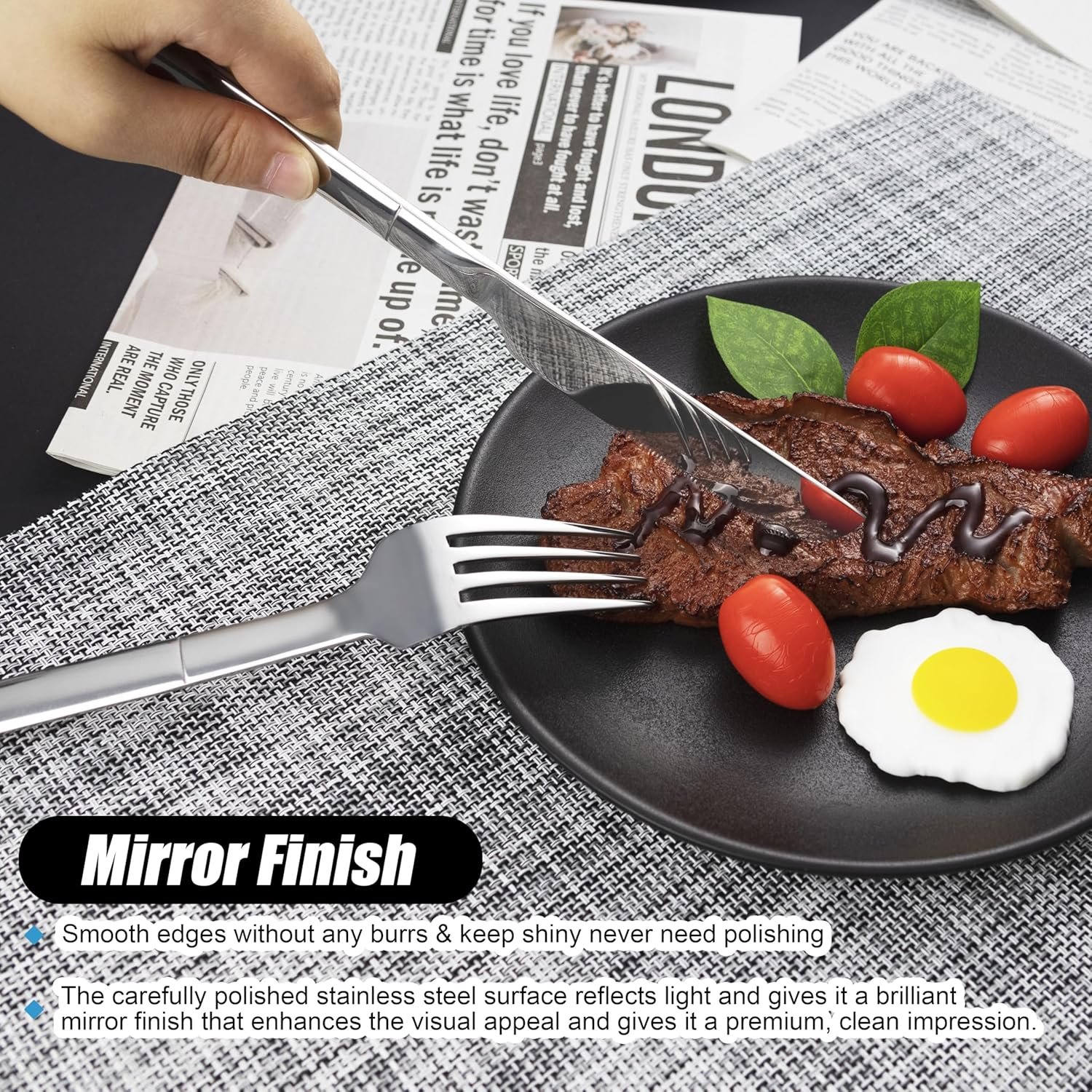 • Elegant Design: The wide, flat handles with cutting lines offer a comfortable grip, while the highly mirror-polished finish and classic shape design give the set a stunning appearance.