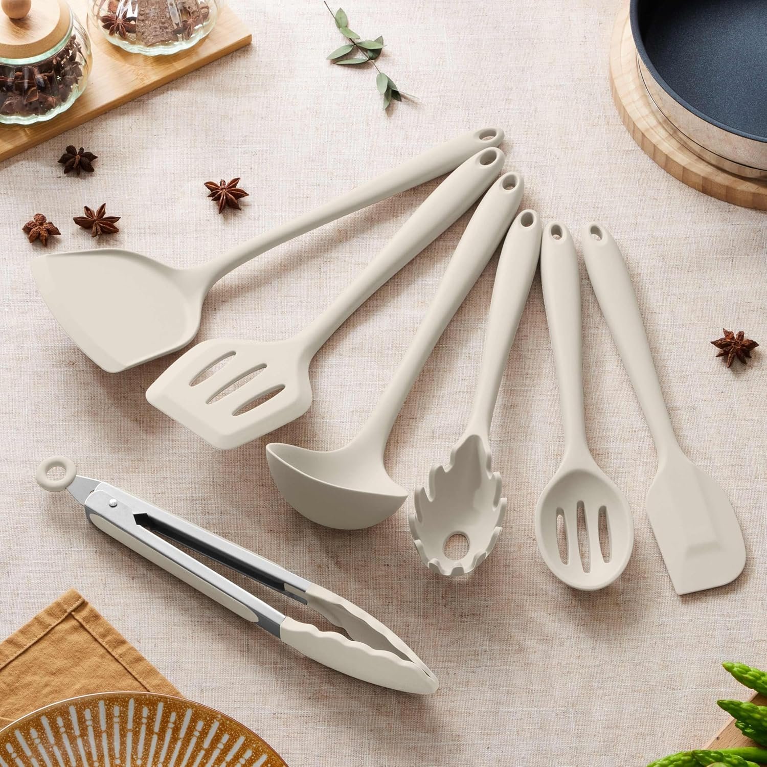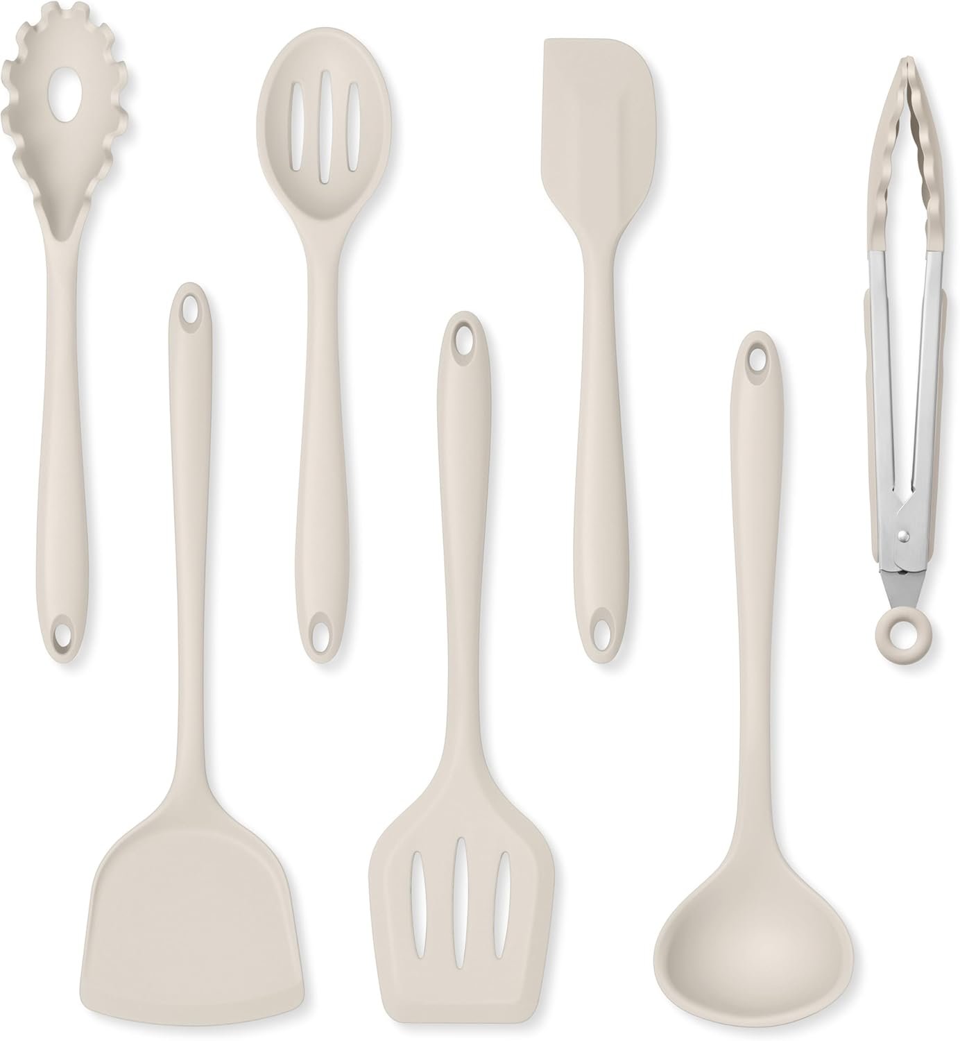 This essential cooking utensils set includes 7 pieces of basic kitchen utensils that meet all your needs. The set includes a soup ladle, solid turner, slotted turner, slotted spoon, pasta server, tong, and large spatula. This versatile collection adapts to diverse cooking and baking tasks, from stirring sauces to flipping delicate dishes.