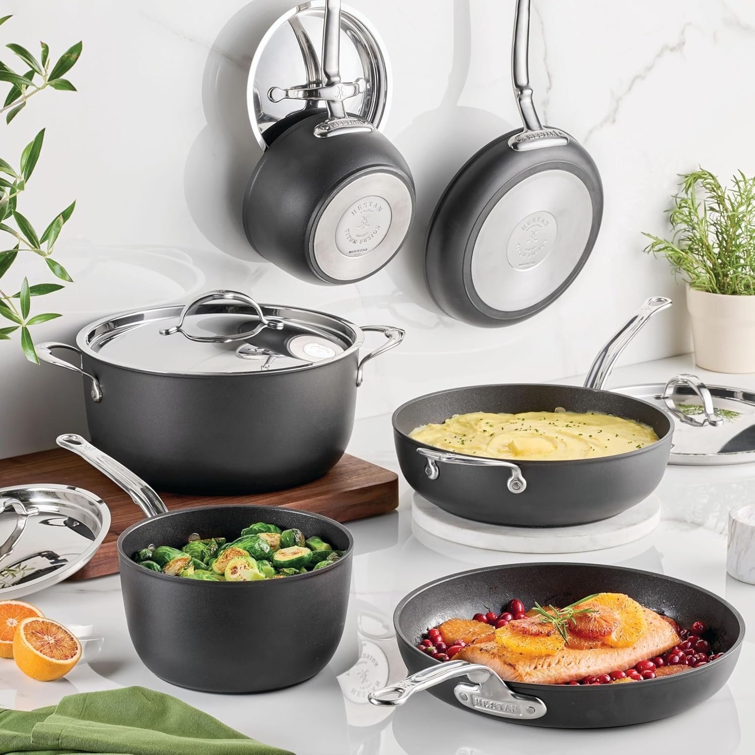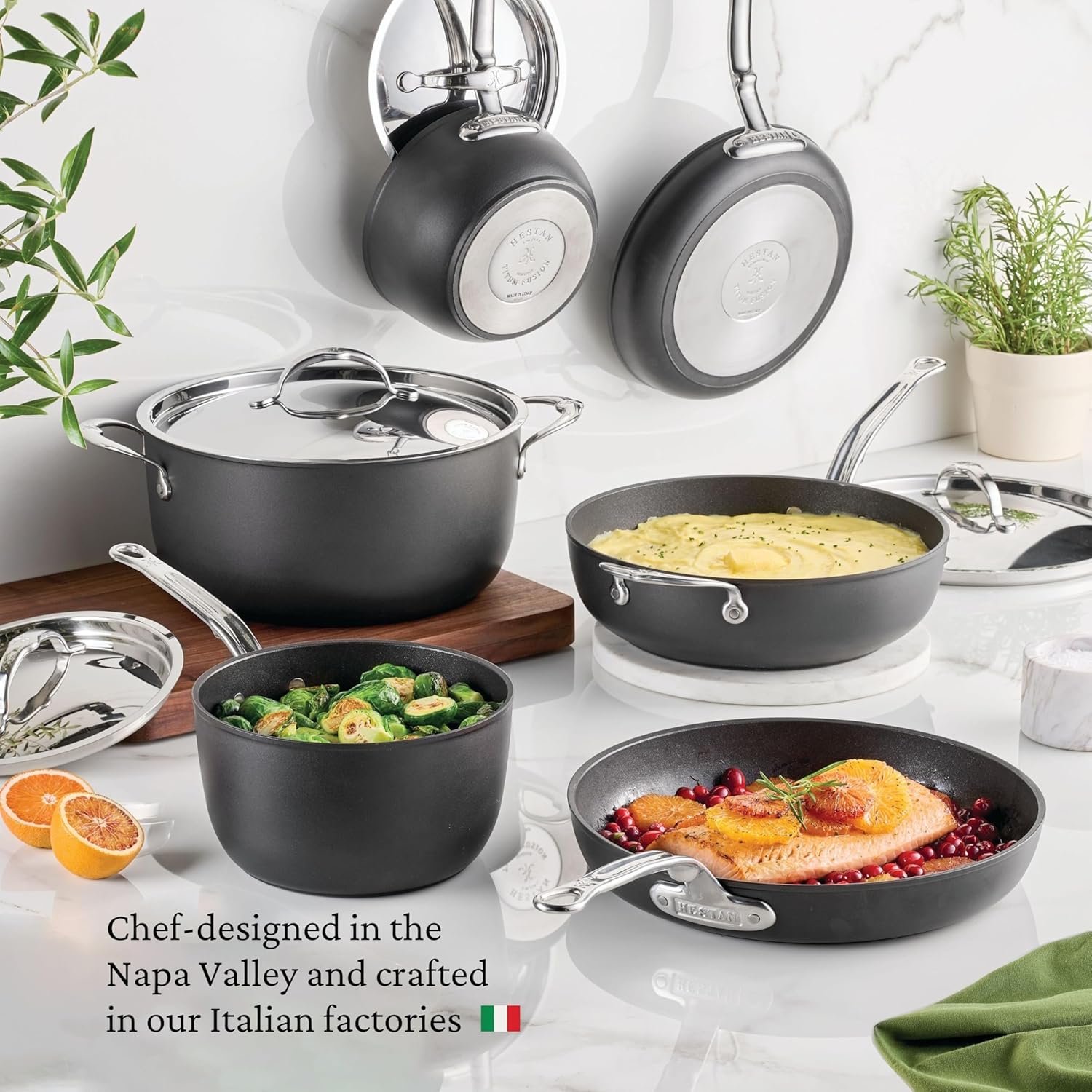 Elegant by Design. Engineered for Endurance. Handcrafted in Italy, the Hestan TITUM Fusion Double Impact Nonstick Collection redefines durability and everyday performance. Its patented Double Impact stainless-steel base keeps pans perfectly flat under pressure, centering oil for superior browning and ensuring stability across all cooktops, including induction.