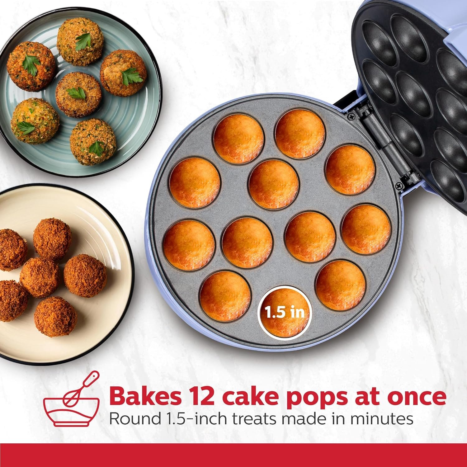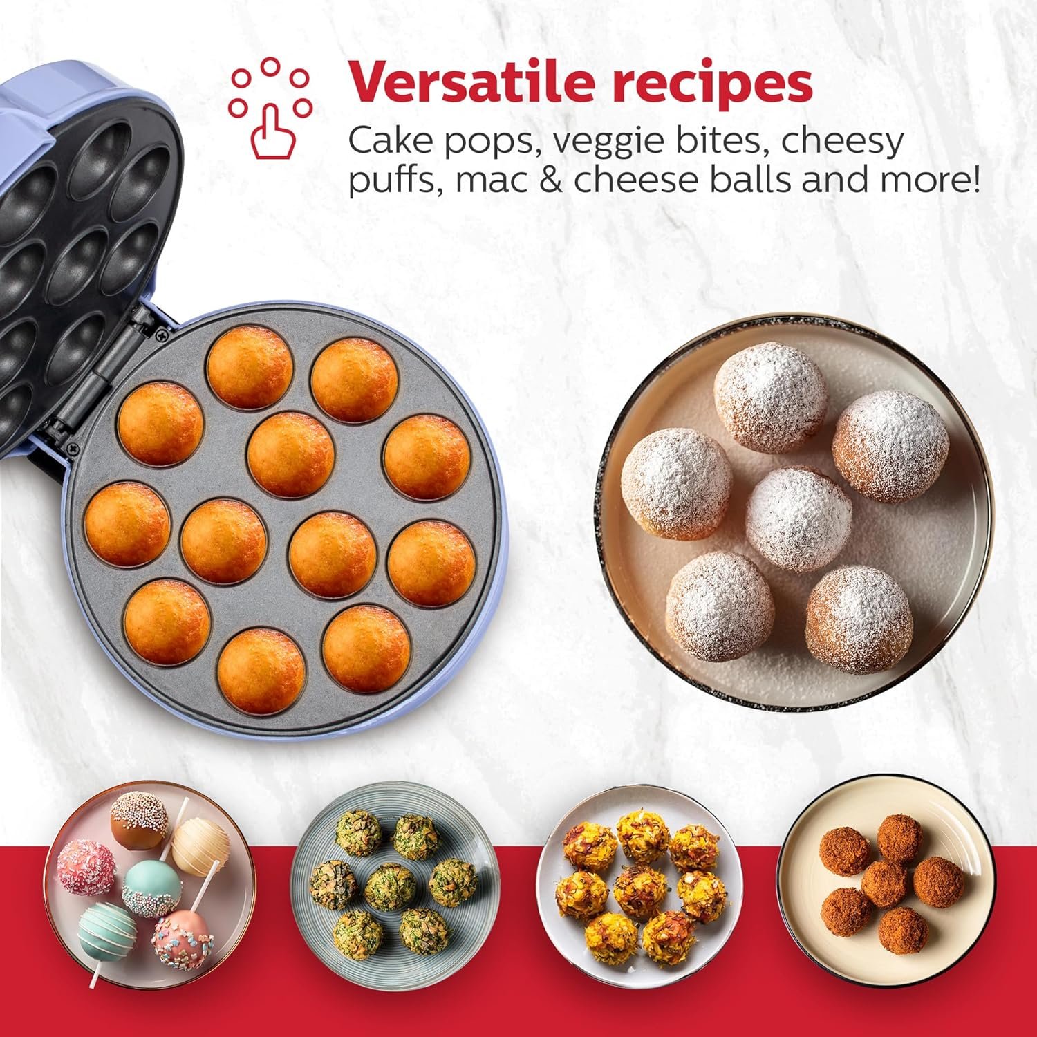 - Bakes up to 12 cake pops, brownie bites, donut holes, or savory snacks in minutes, no oven required.