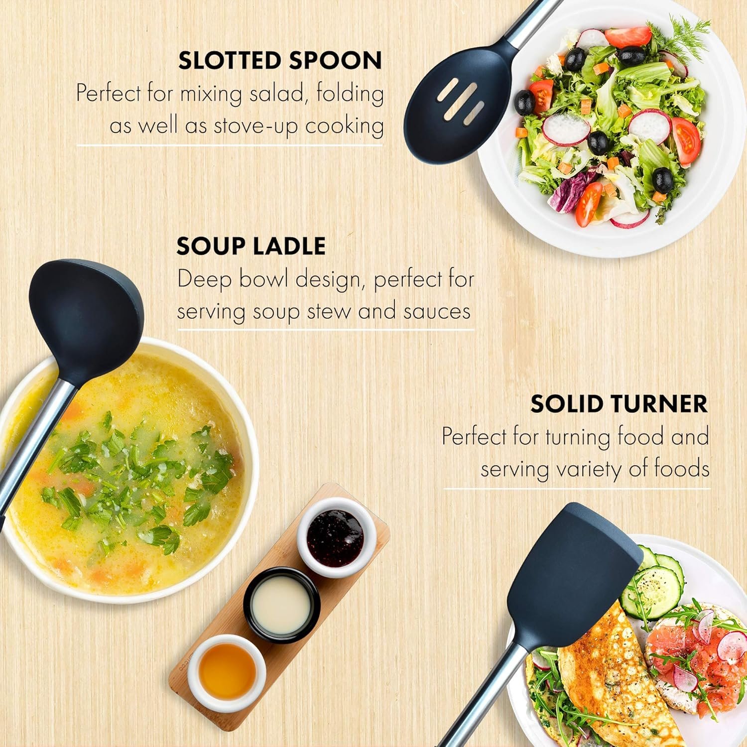 - Heat-resistant and non-stick silicone cooking utensils