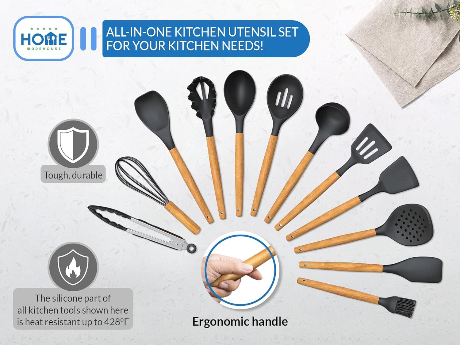 Our premium kitchen utensil set is designed to provide top-tier durability and performance for home cooks. The set features tough, rust-proof construction, with food-grade silicone and wooden handles that ensure longevity and protection against rust.