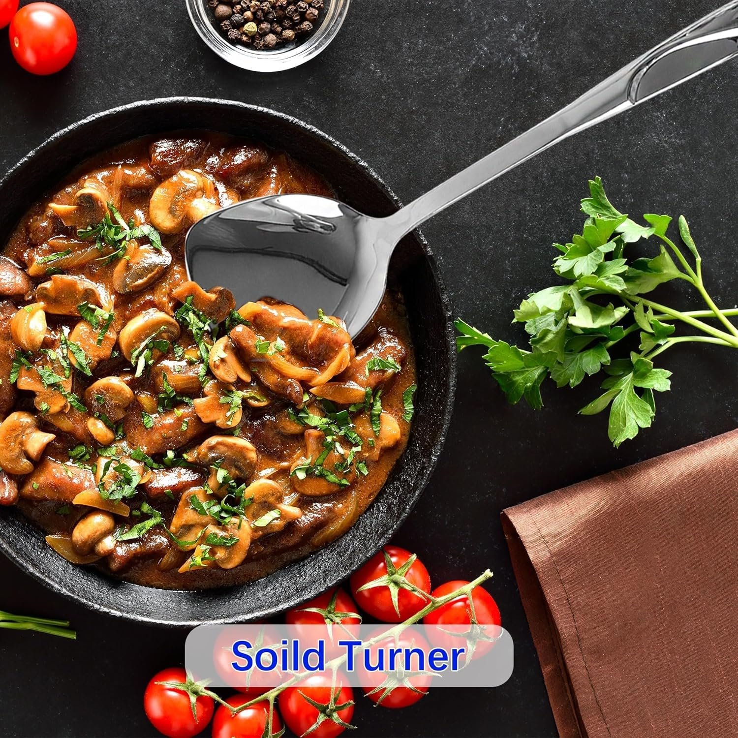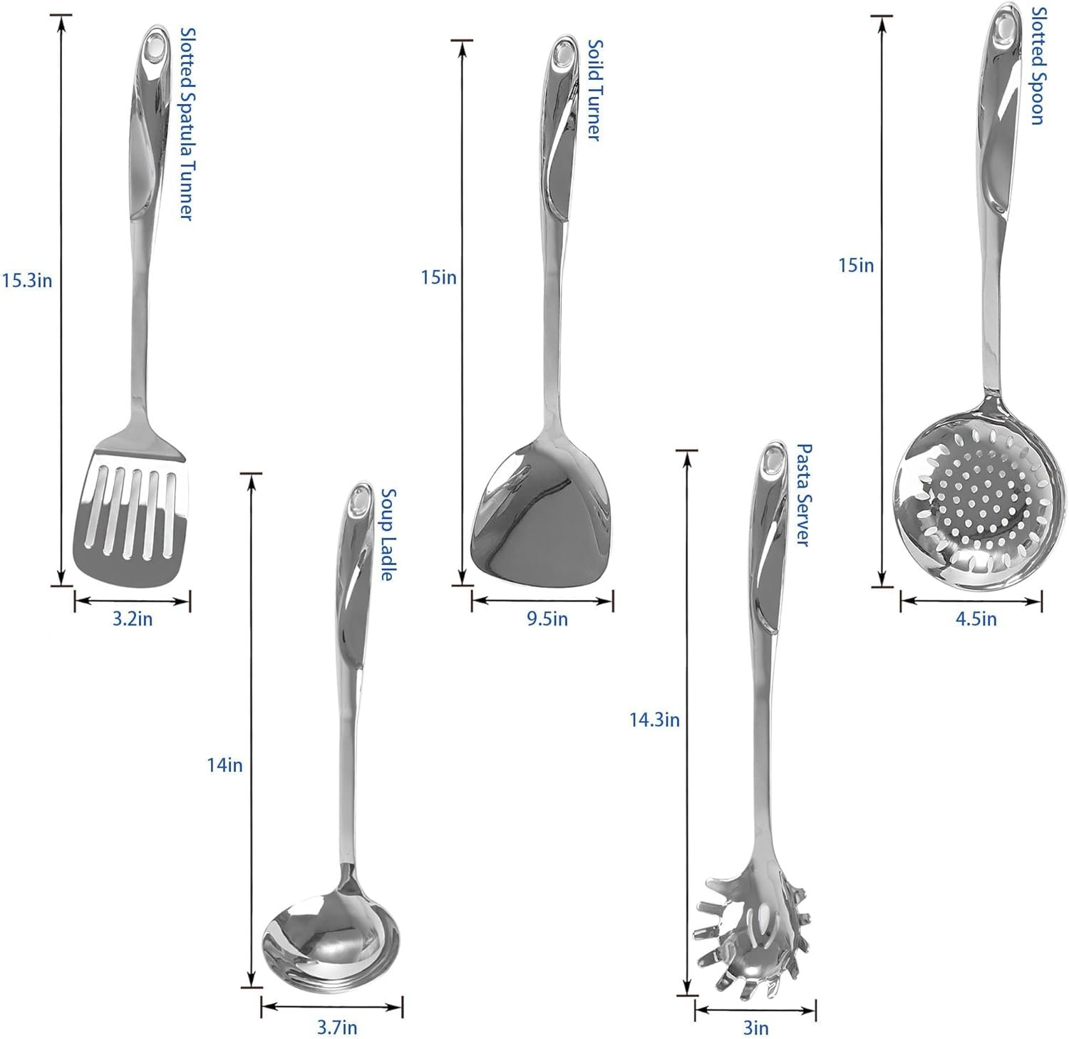 - 5-piece set: slotted spatula, soup ladle, solid turner, pasta server, and skimmer