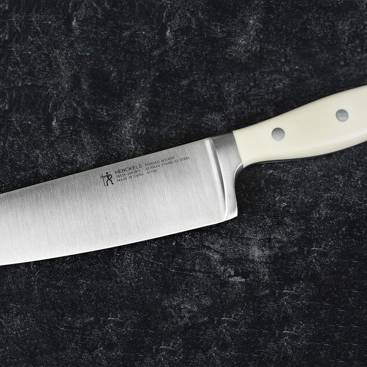 The Zwilling J.A. Henckels International Forged Accent Series is a premium knife set that boasts exceptional durability and balance. The elegant off-white handles and stainless steel blades provide a full tang handle, ensuring a comfortable grip and effortless cutting experience. The three-rivet design offers excellent balance, while the metal end cap displays the iconic Henckels logo.