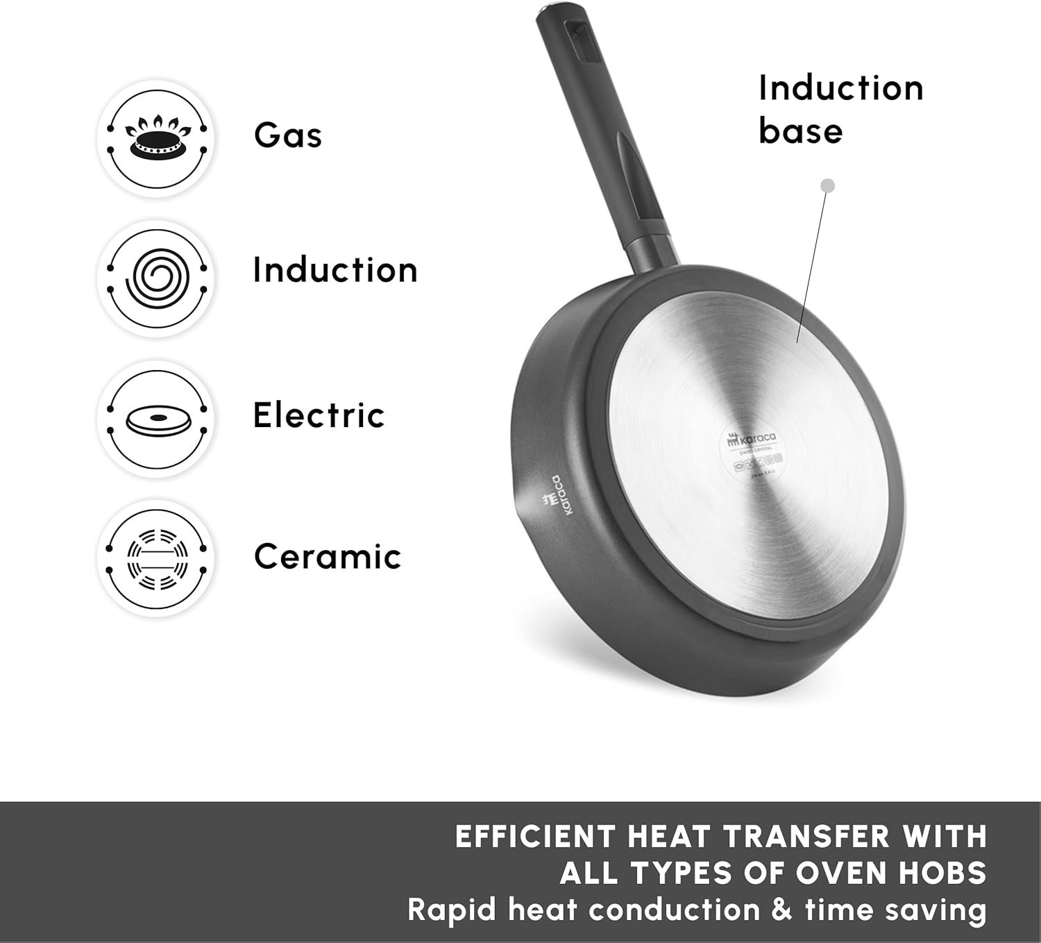The Karaca Swiss Crystal Midnight 6-Piece Cookware Set is designed to provide top-notch non-stick performance and advanced induction compatibility, making it perfect for any kitchen. This cookware set ensures even heat distribution for precise cooking and features an easy-to-clean, dishwasher-safe surface for everyday convenience and durability.