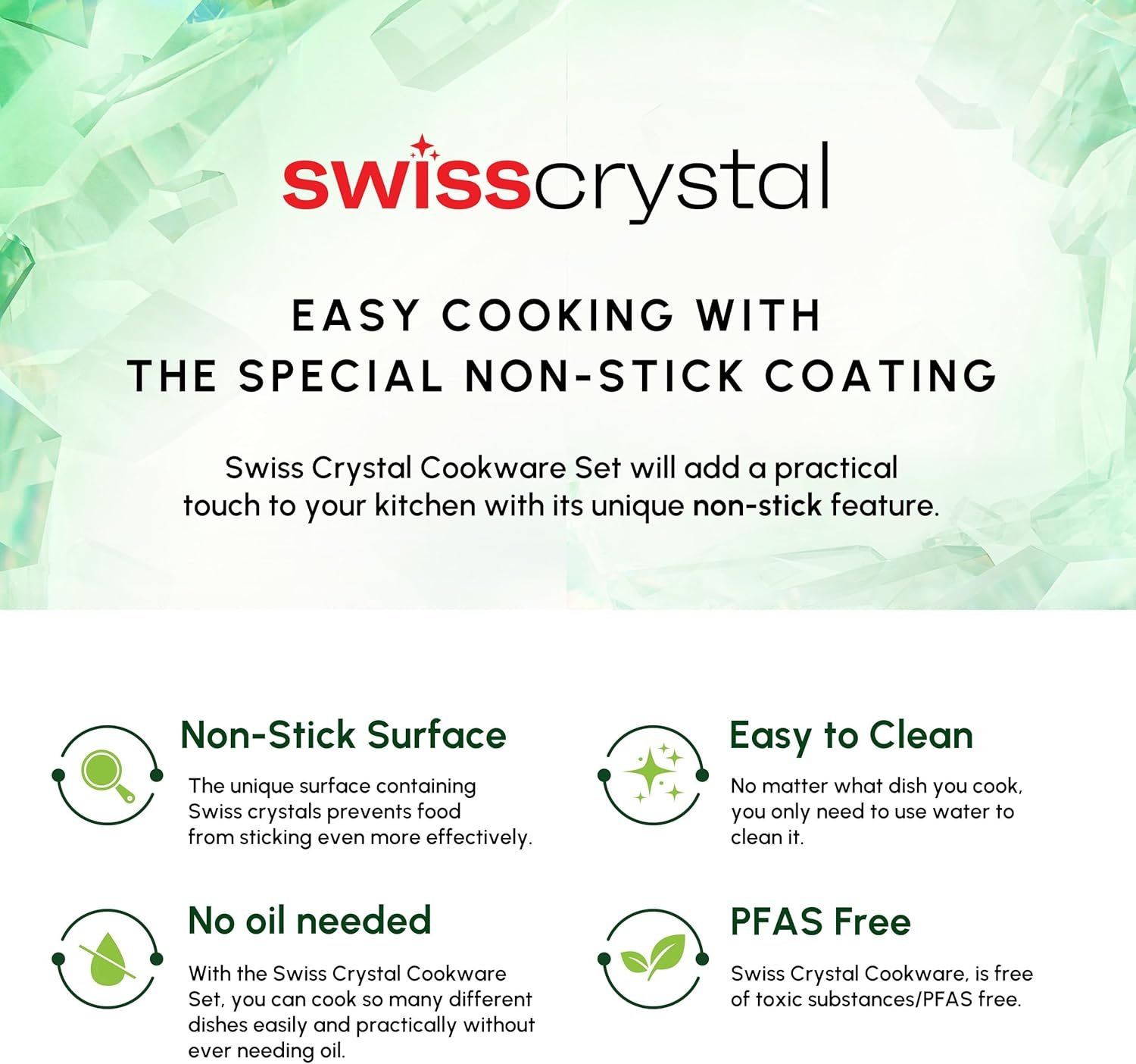 - Durable and Long-Lasting: The Swiss Crystal Ceramic coating ensures the cookware set remains non-stick and durable over time.