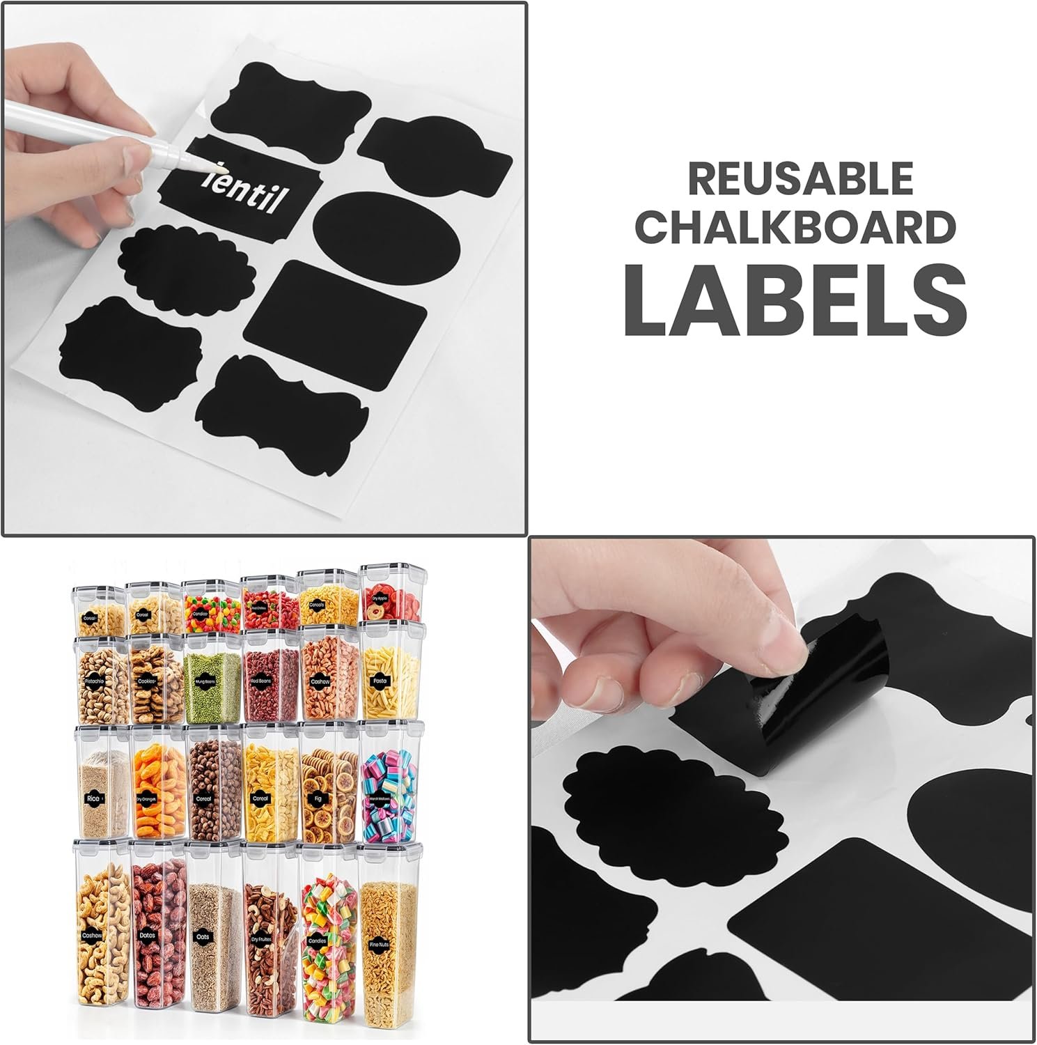 • Marker & Labels: Our food storage set comes with reusable chalkboard labels and a chalkboard marker, so you can mark the food stored in each container for your convenience.