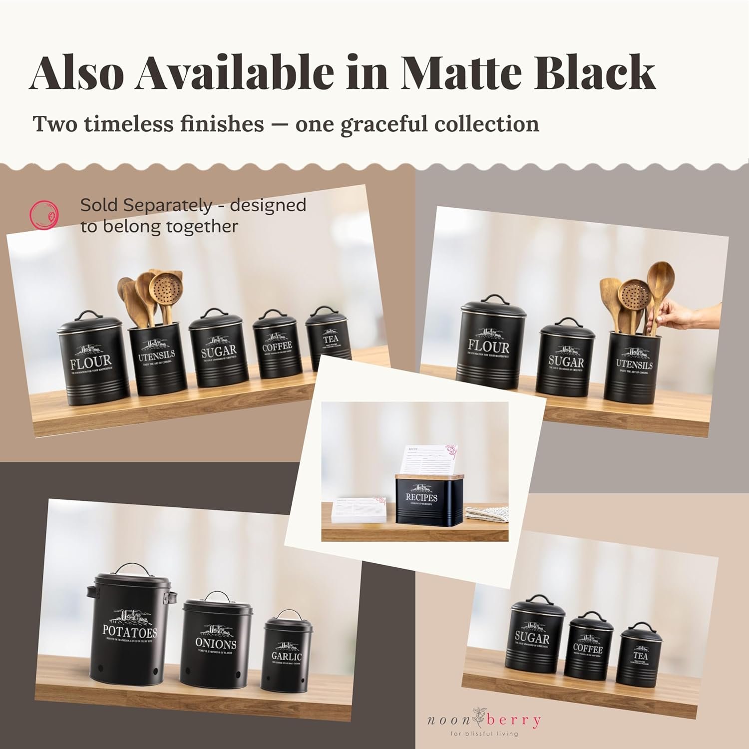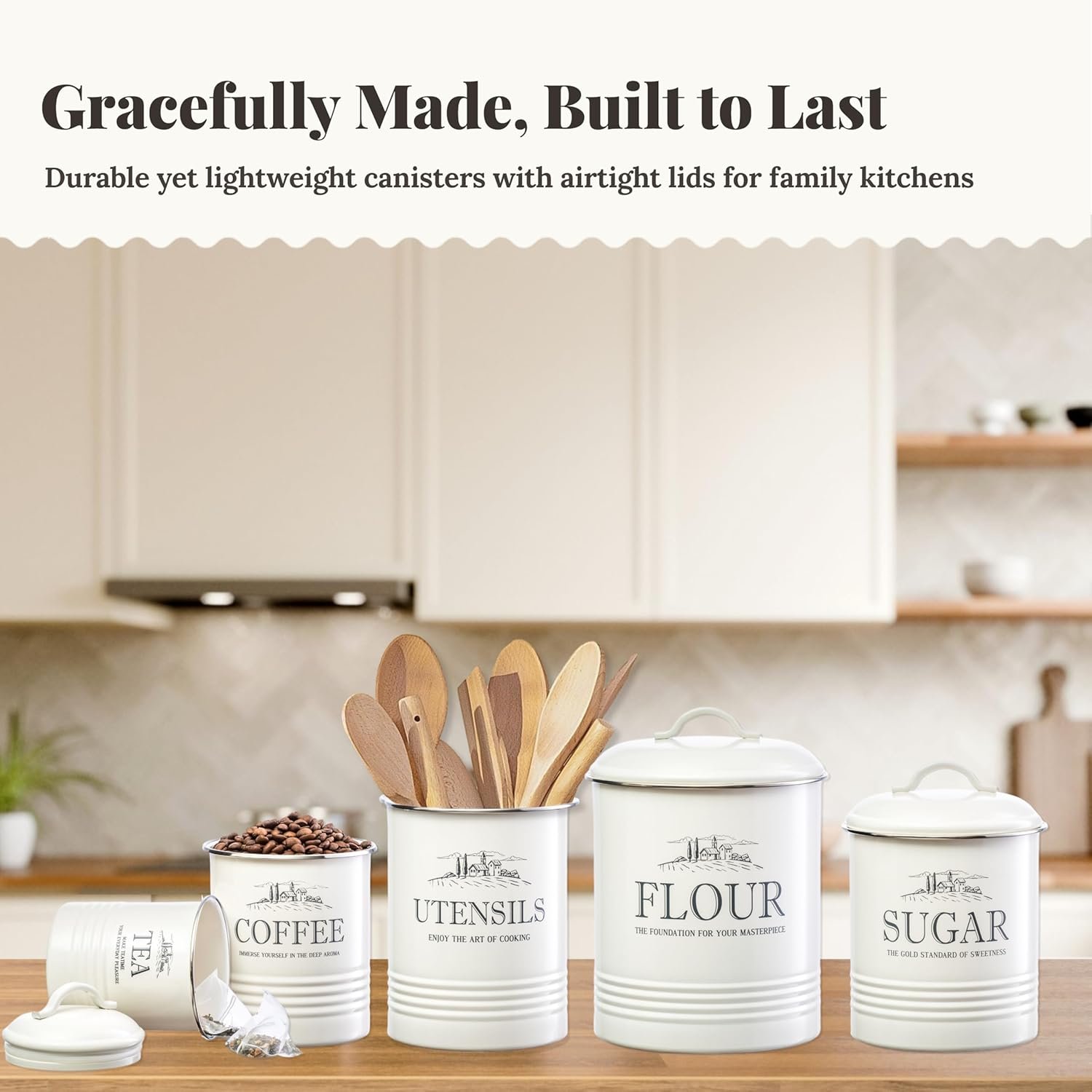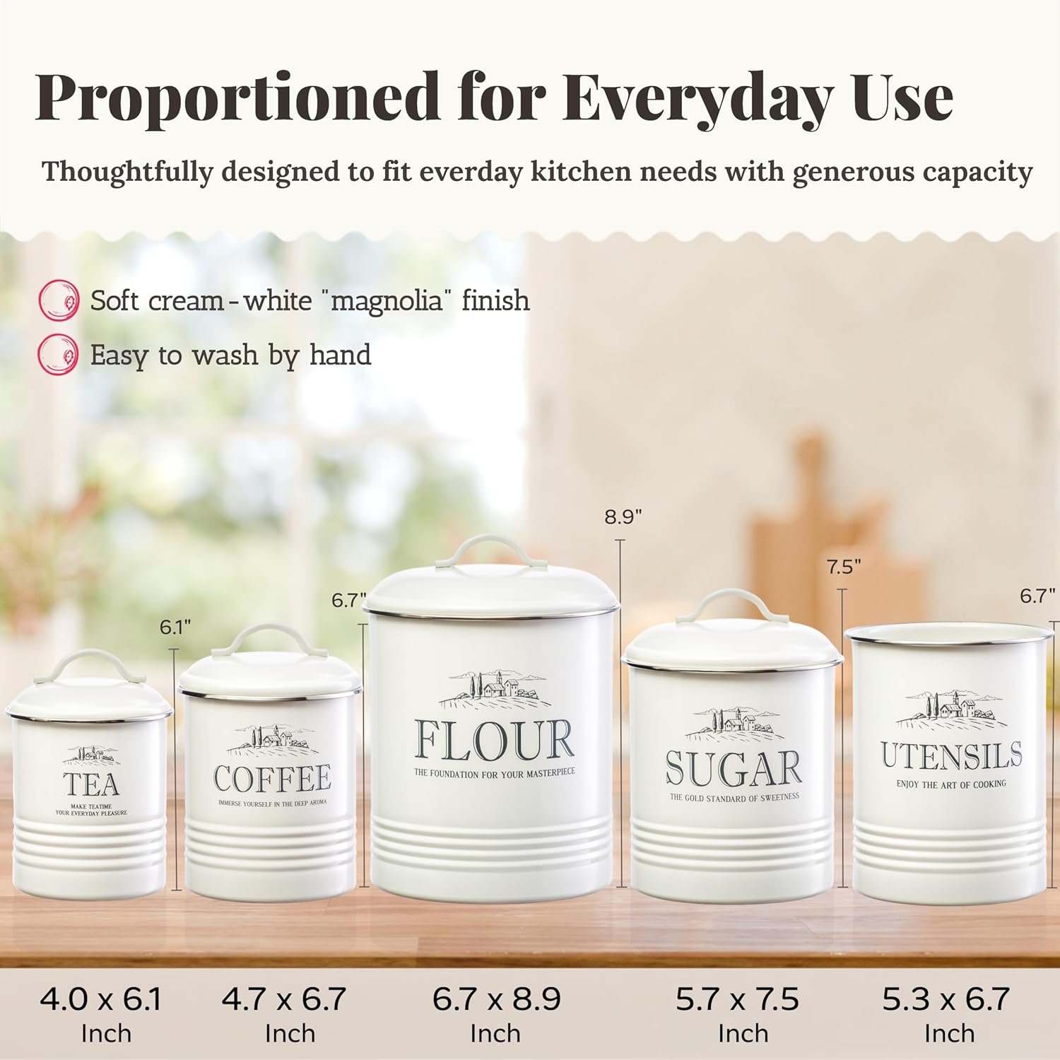 - A complete 5-piece set including flour, sugar, coffee, and tea canisters, plus a utensil holder
