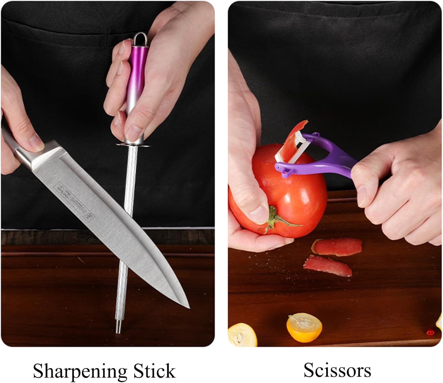 The knife set is made of high-quality German stainless steel, ensuring superior strength, durability, and corrosion resistance. The V-shaped design of the cutting edge is very sharp, making it easy to chop and slice various ingredients. The ergonomic handle design provides a comfortable grip, fitting naturally in your hand and reducing fatigue during long use.