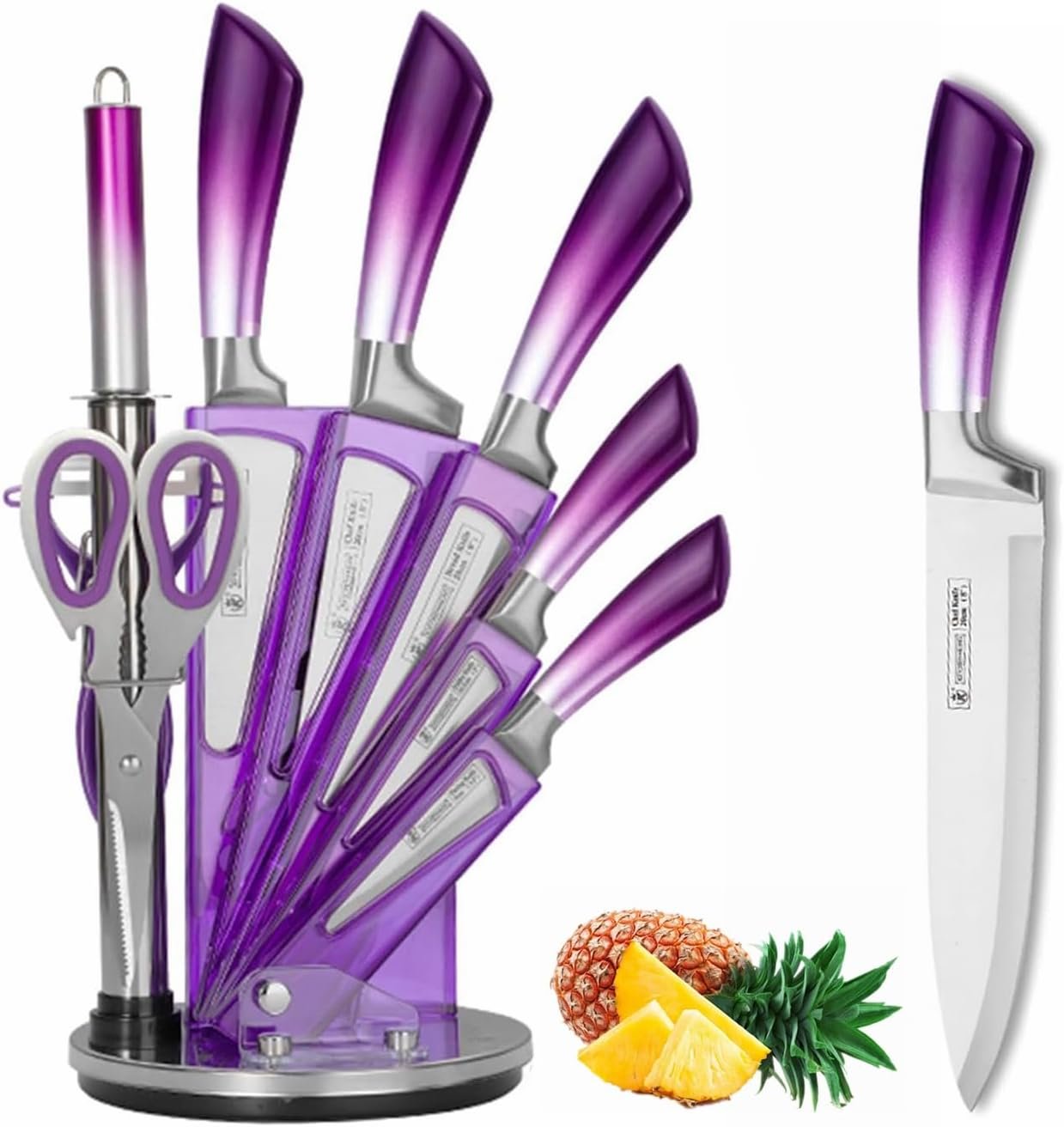 The set also includes a beautiful and stable acrylic knife block with 360-degree rotation, allowing you to easily store and access all the knives. The block helps keep your kitchen organized and neat.