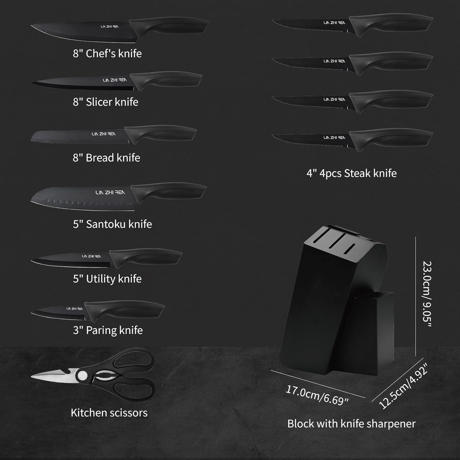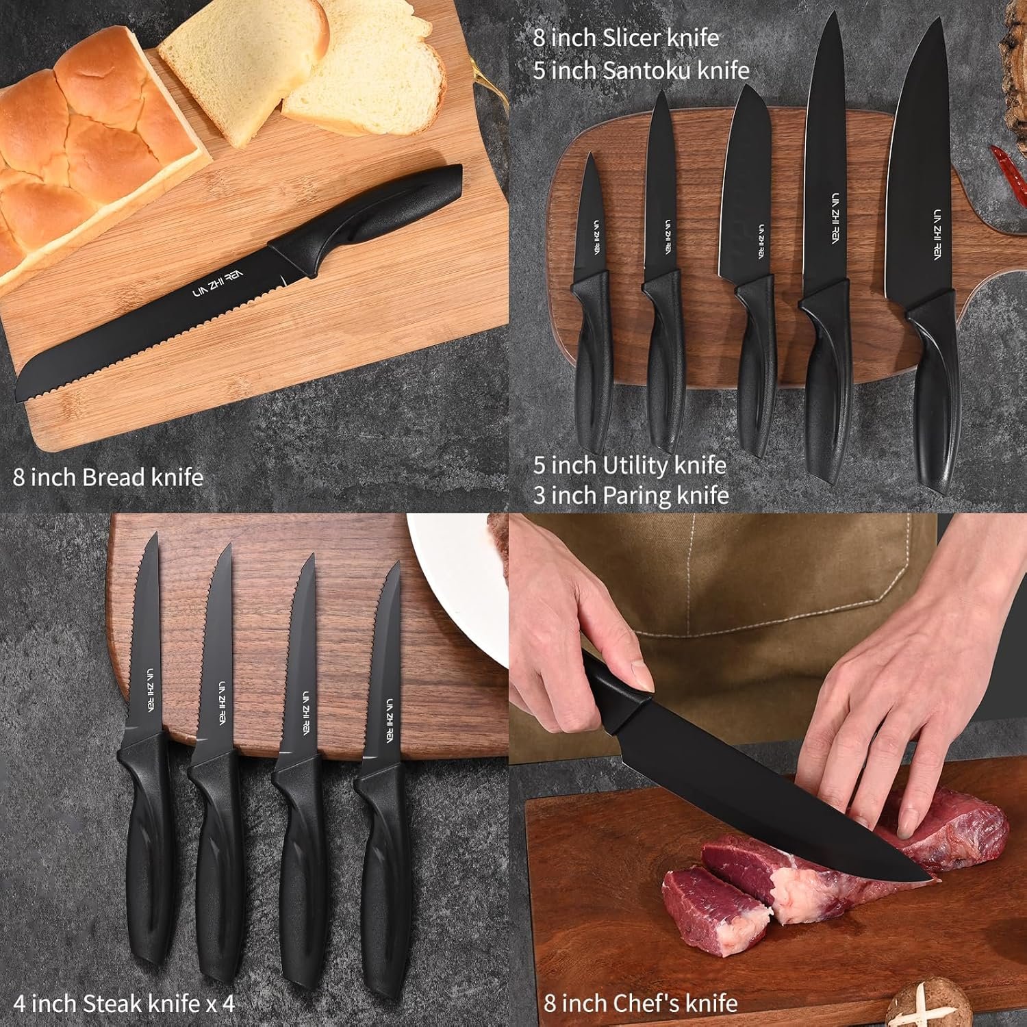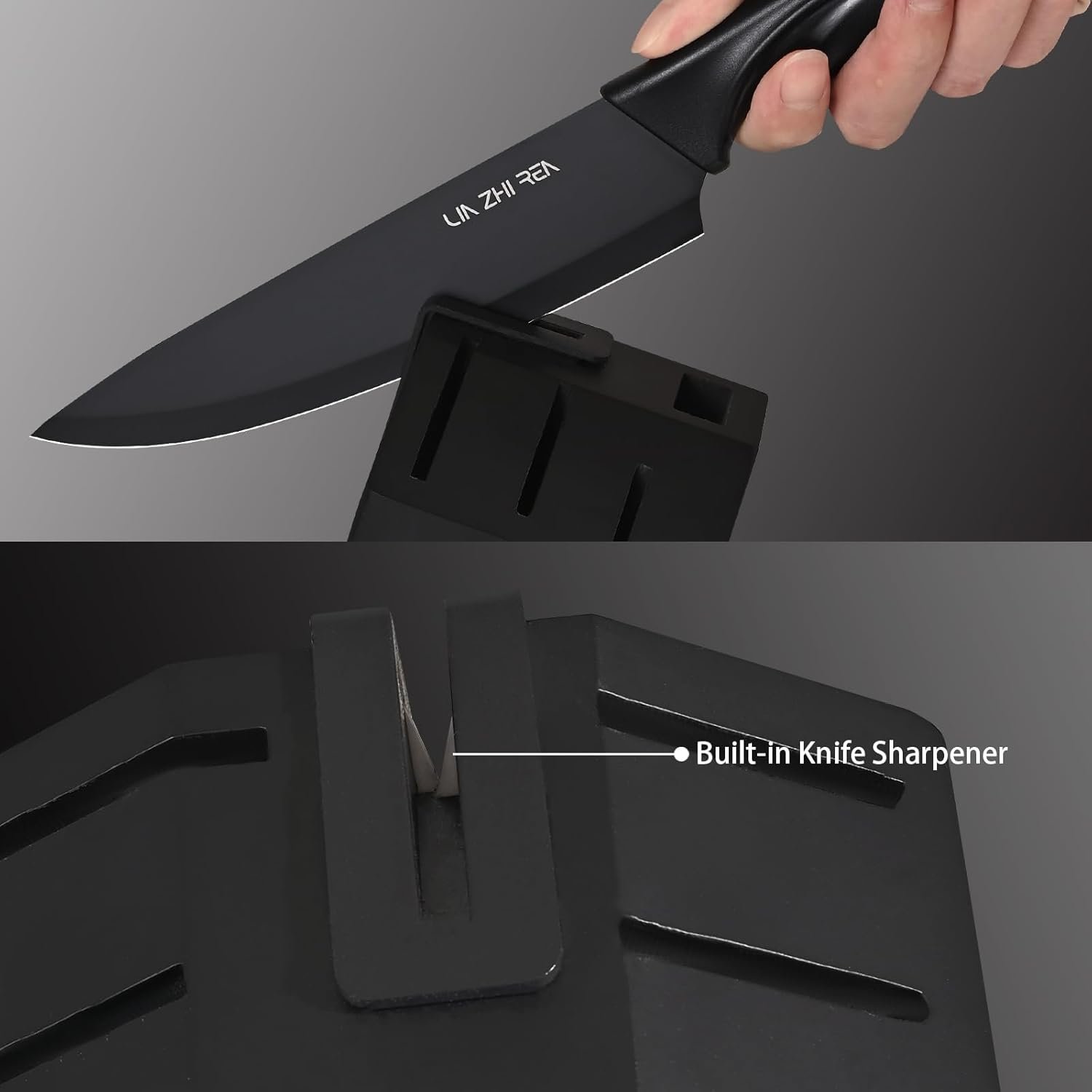 - German Steel with Anti-Slip Grip: Black knife set features German stainless steel blades with Teflon coating for non-stick and rust-resistant performance.