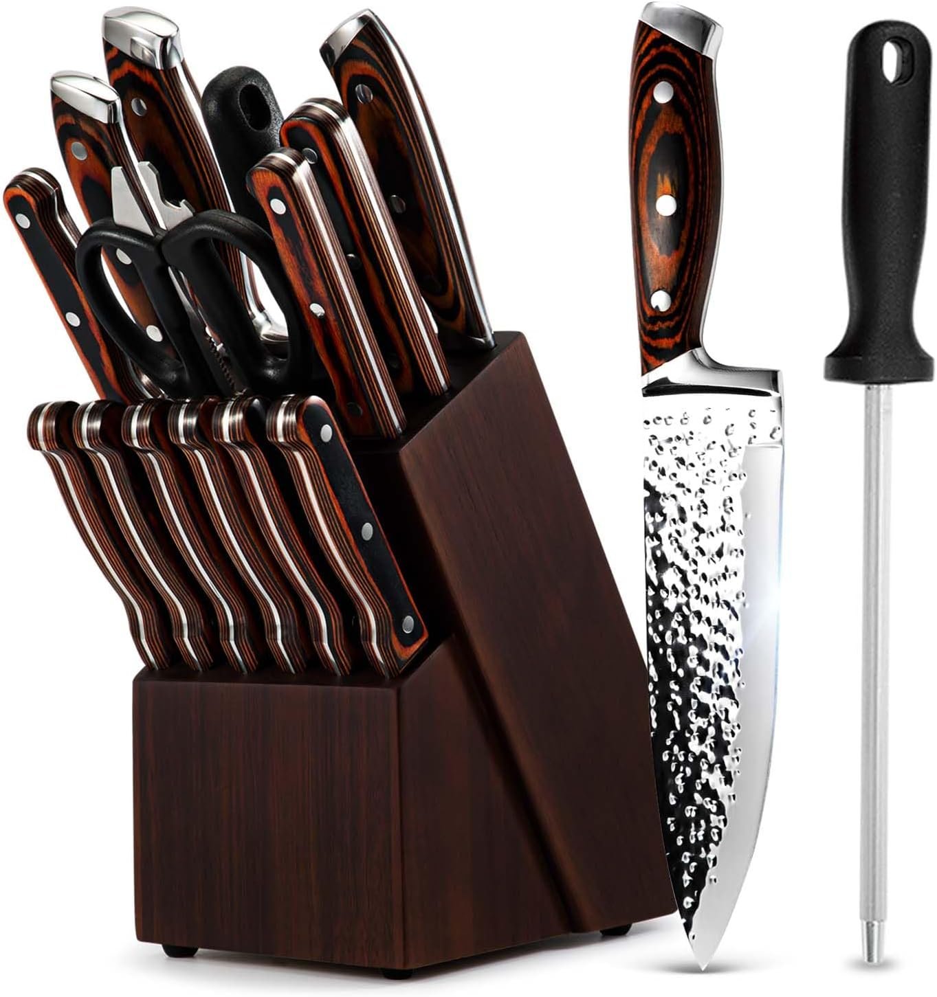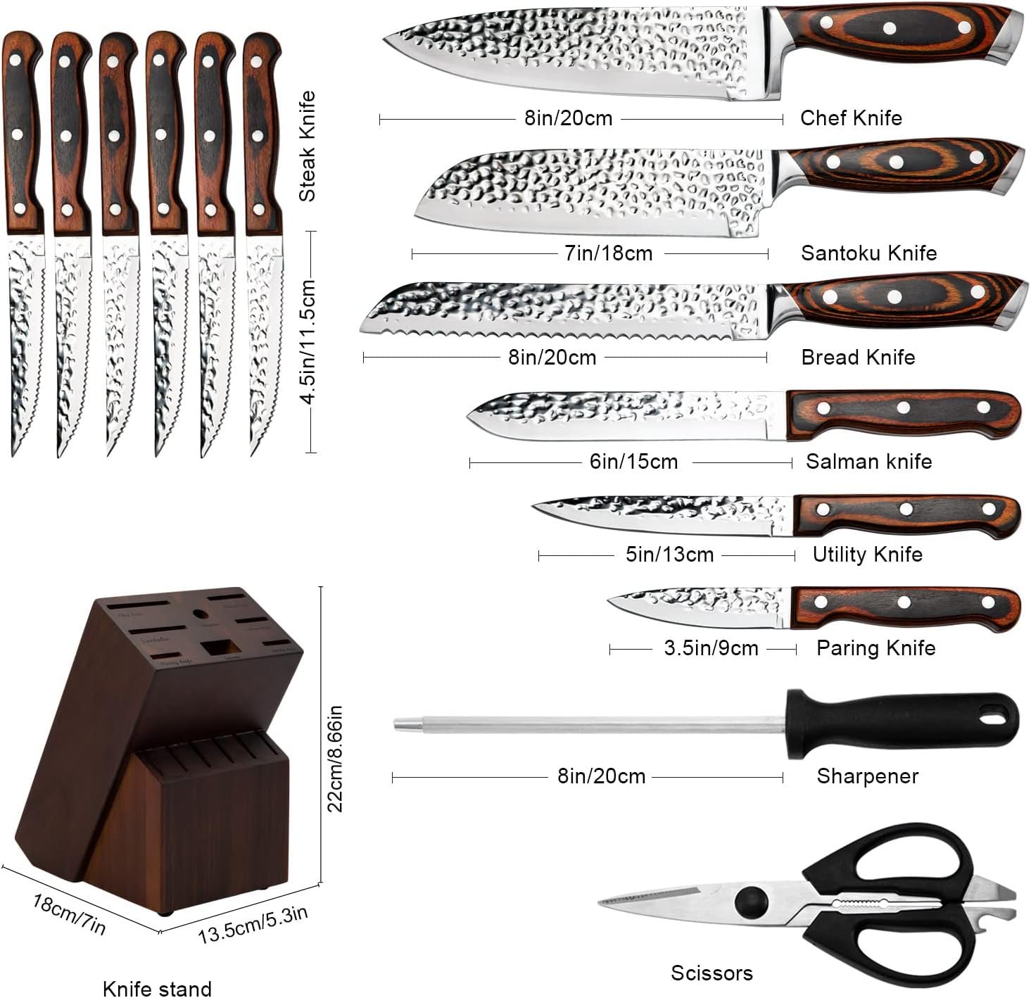 - Easy Storage: The knife set with block is easy to maintain, with all knives storing safely in the hardwood knife block with sharpener for space-efficient storage.