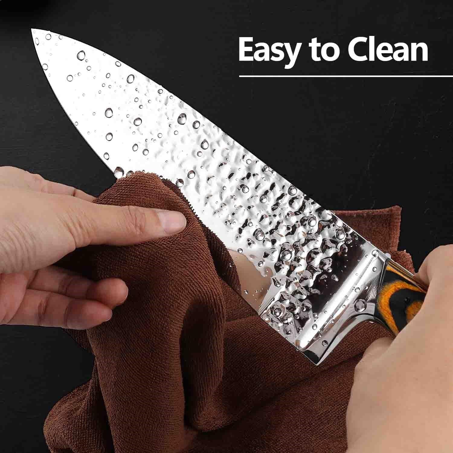 - Aesthetically Pleasing: The unique hammer pattern design and wooden handle give the knives a classic and sophisticated look.