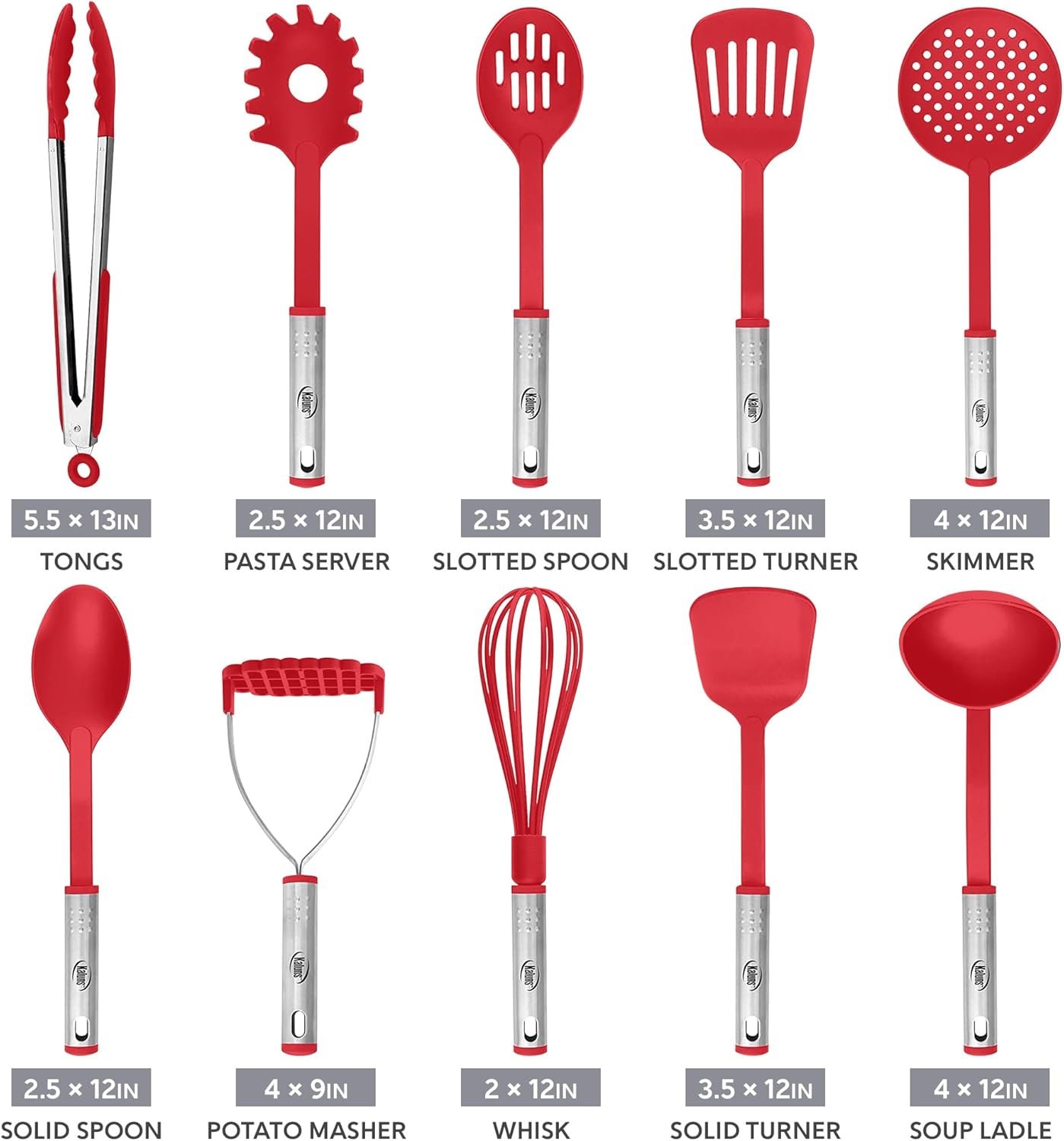 Let your inner "Chef Talents" come shining through with this stylish & elegant Kaluns Cooking tools set. Enjoy the unique variety of the best and highest quality cooking utensils set which will serve you everything you can possibly need to prepare that perfect dish. This set includes: Solid Spoon, Slotted Spoon, Solid Turner, Slotted Turner, Soup Ladle, Whisk, Skimmer, Pasta Server, Potato Masher, and Tong.