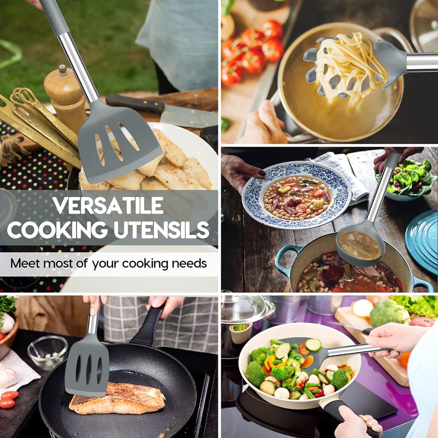 - Easy to use: The utensils have a velvety silicone wrap on the handle for a heat and skid-proof grasp, and the smooth edge prevents cutting your hand.