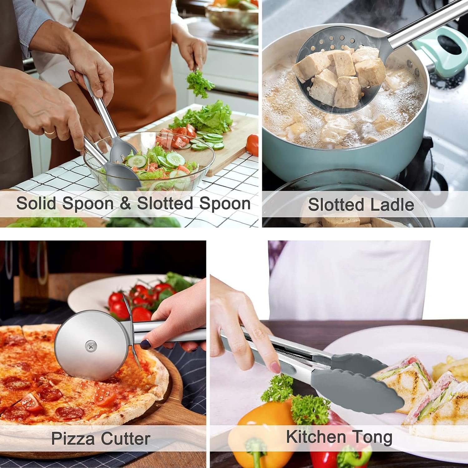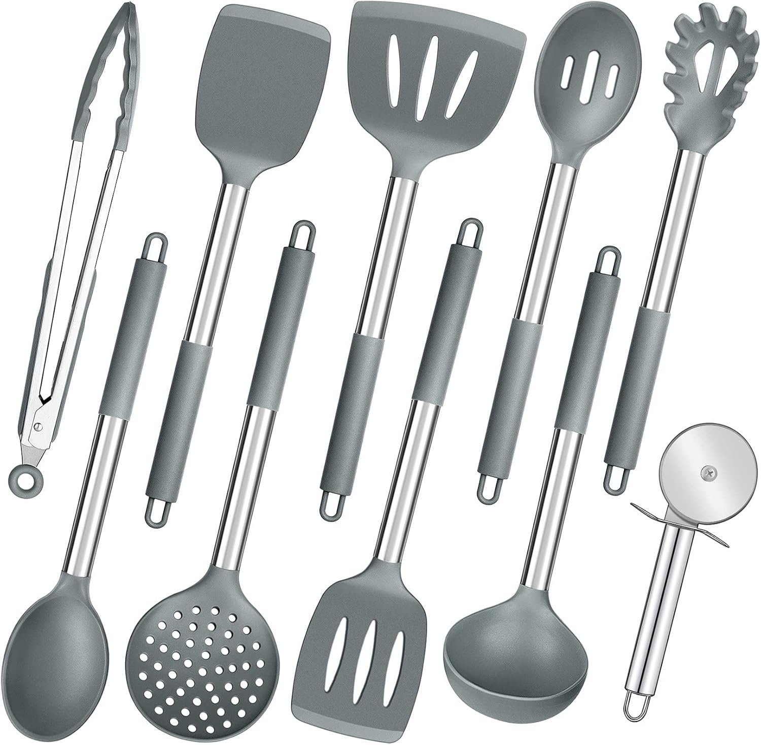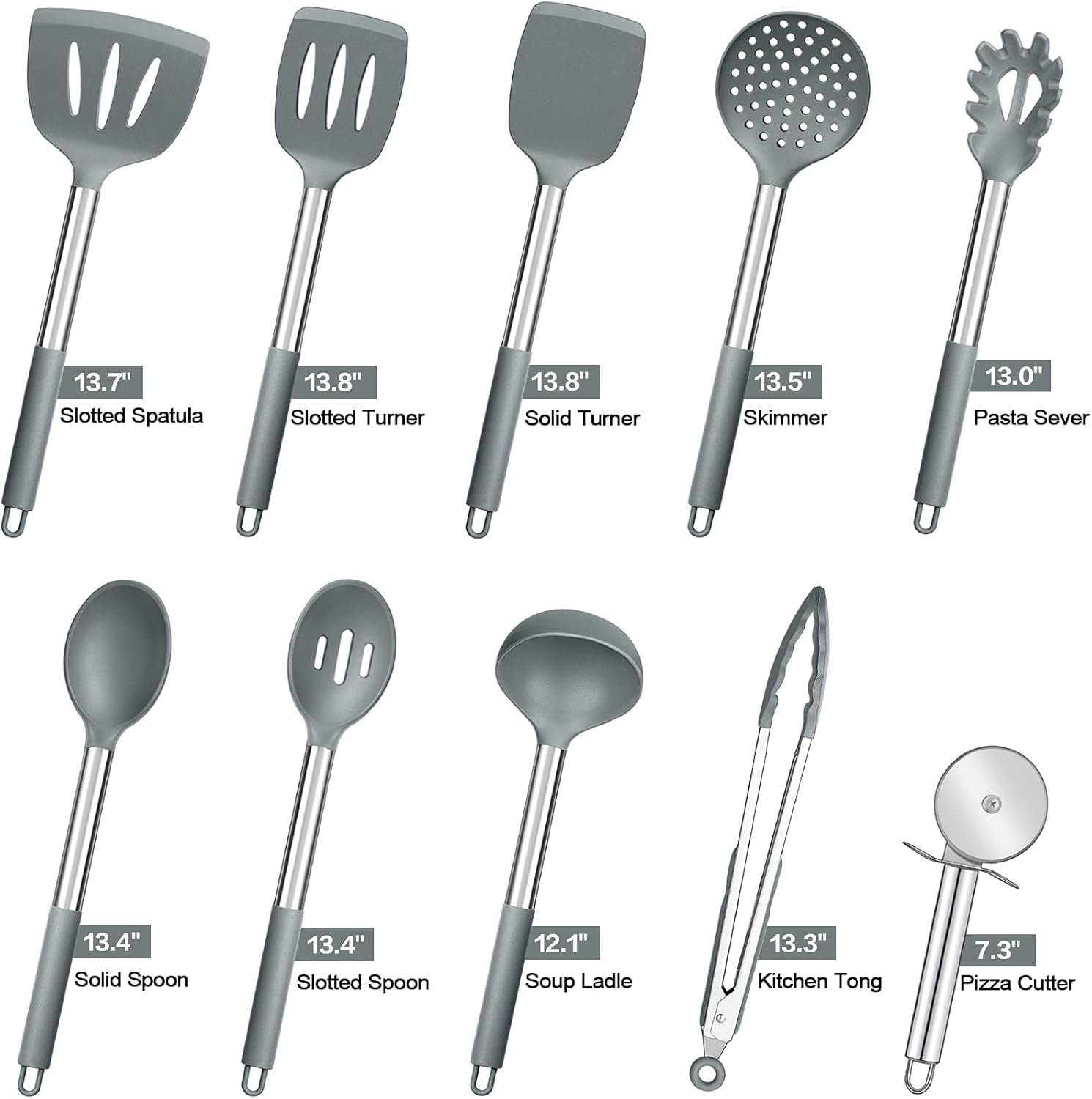- Package includes: Slotted Spatula, Slotted Turner, Solid Turner, Skimmer, Pasta Server, Solid Spoon, Slotted Spoon, Soup Ladle, Kitchen Tong, Pizza Cutter